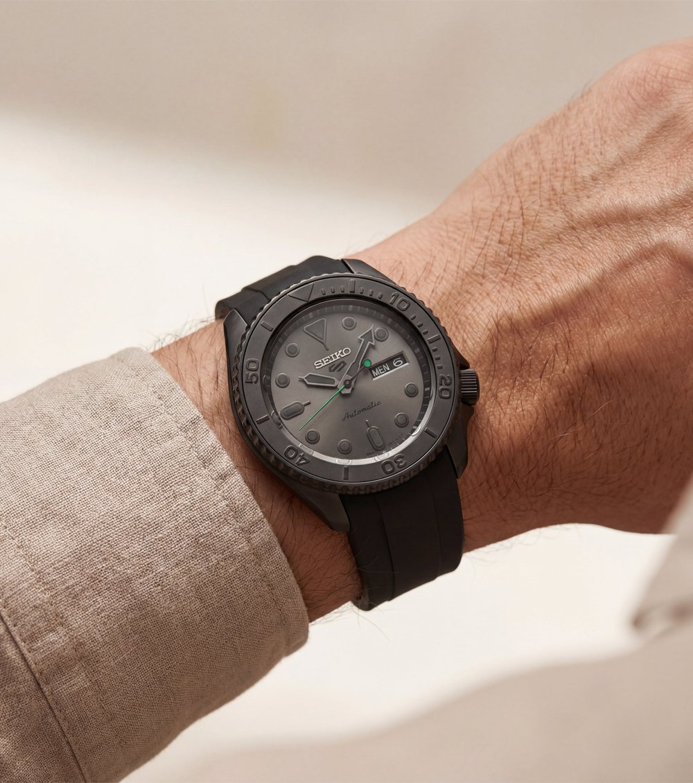 Housed in a blacked-out stainless steel case with a unidirectional dive-style bezel, the watch exudes professional dive watch energy while remaining refined enough for daily wear. The integrated black rubber strap ensures superior comfort, flexibility, and grip โ ideal for active lifestyles and extended wear.