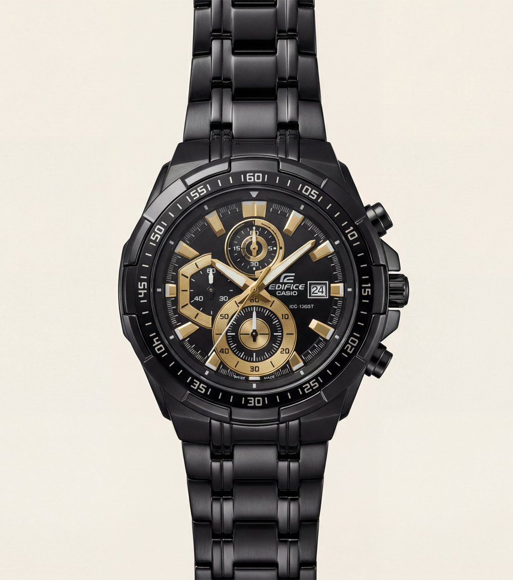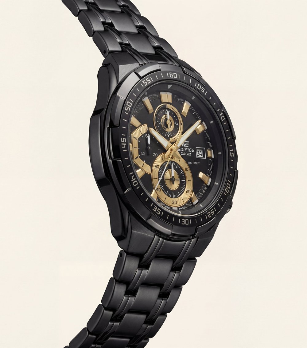 This bold chronograph Men’s watch features a striking all-black stainless steel body highlighted with elegant gold-tone accents for a powerful and premium look. The detailed multi-layer black dial showcases three chronograph sub-dials, sharp applied hour markers, and contrasting hands that enhance both depth and readability.