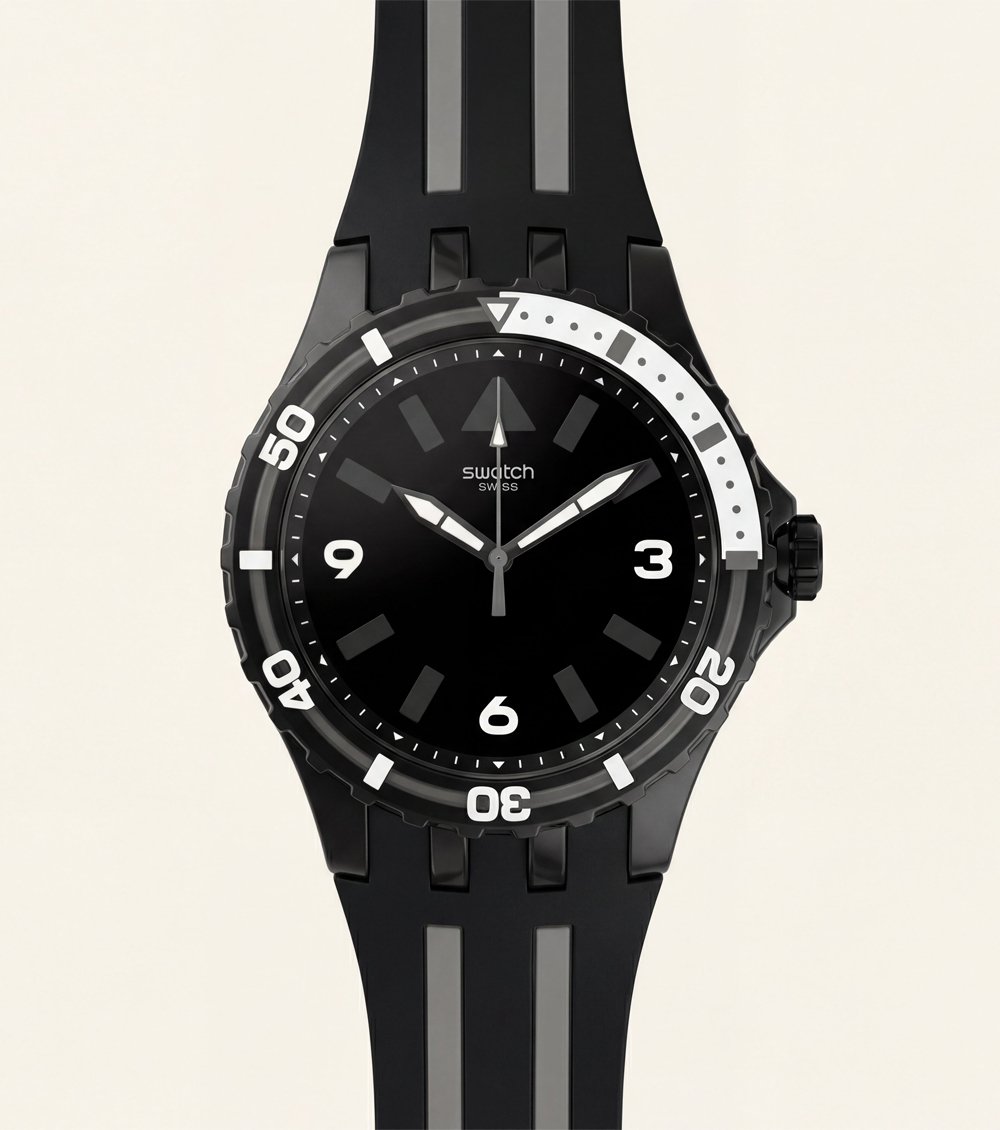This all-black sport Men’s watch delivers a bold, functional look with a clean dive-style design. The deep black dial is paired with high-contrast white numerals and markers, ensuring excellent readability while maintaining a strong, minimalist aesthetic.