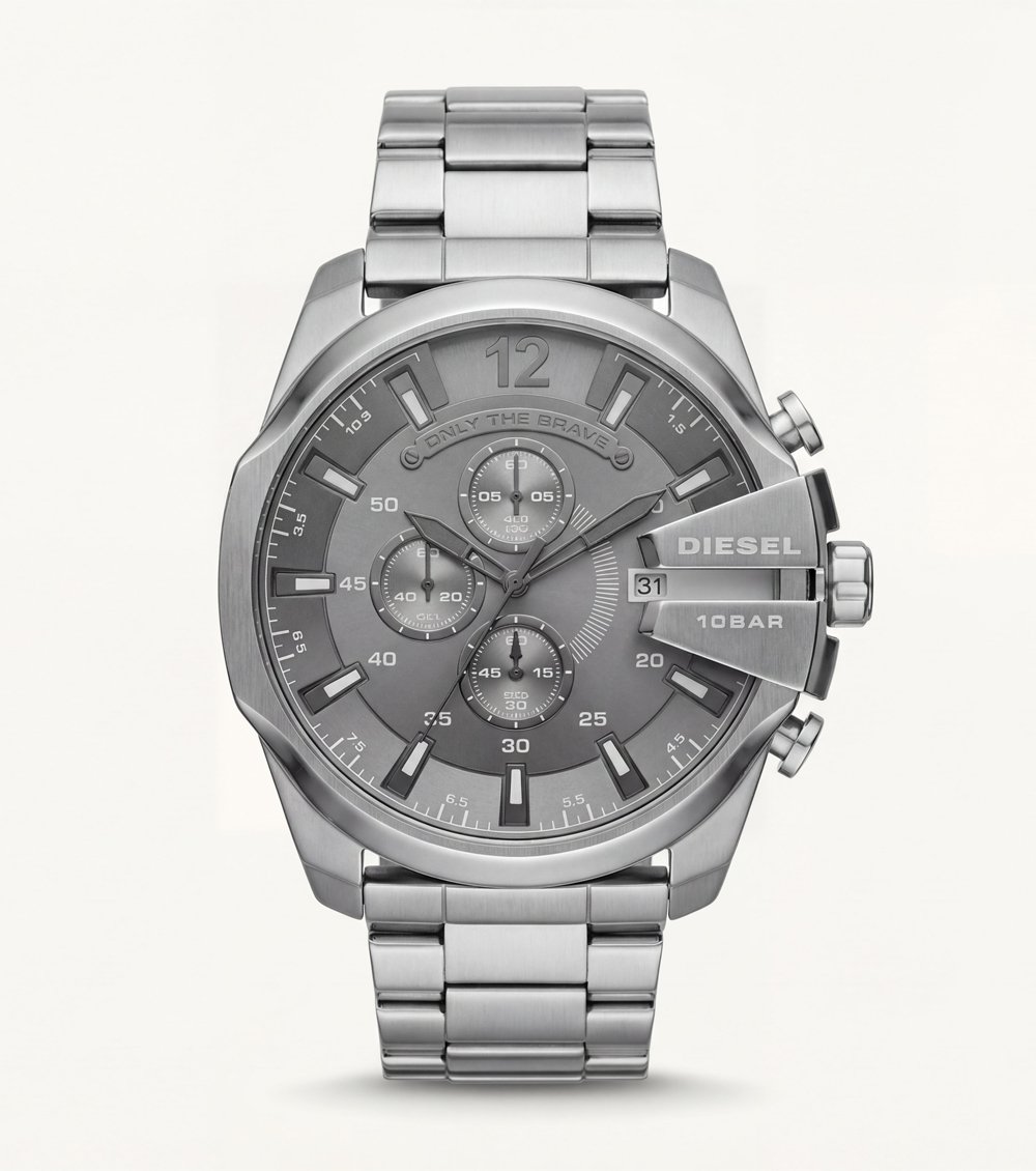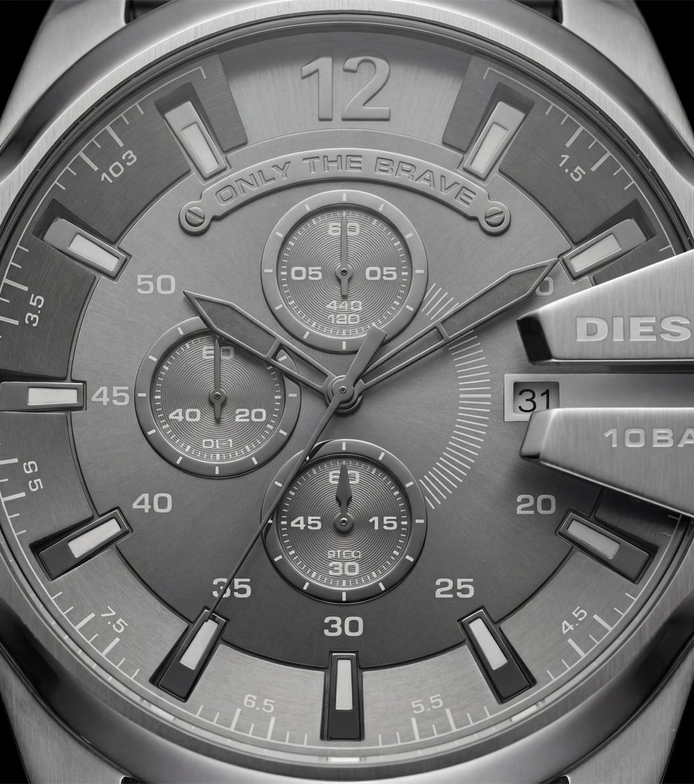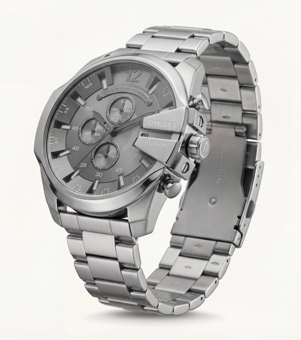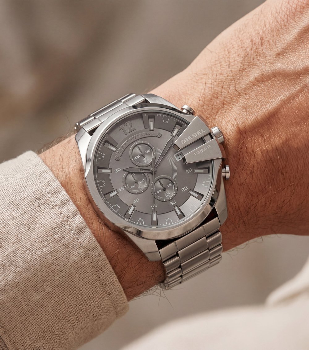 This all-silver chronograph Men’s watch delivers a strong industrial look with a clean monochrome finish. Designed for men who prefer bold yet minimal styling, the brushed silver dial blends perfectly with the solid metal bracelet, creating a premium and professional appearance.