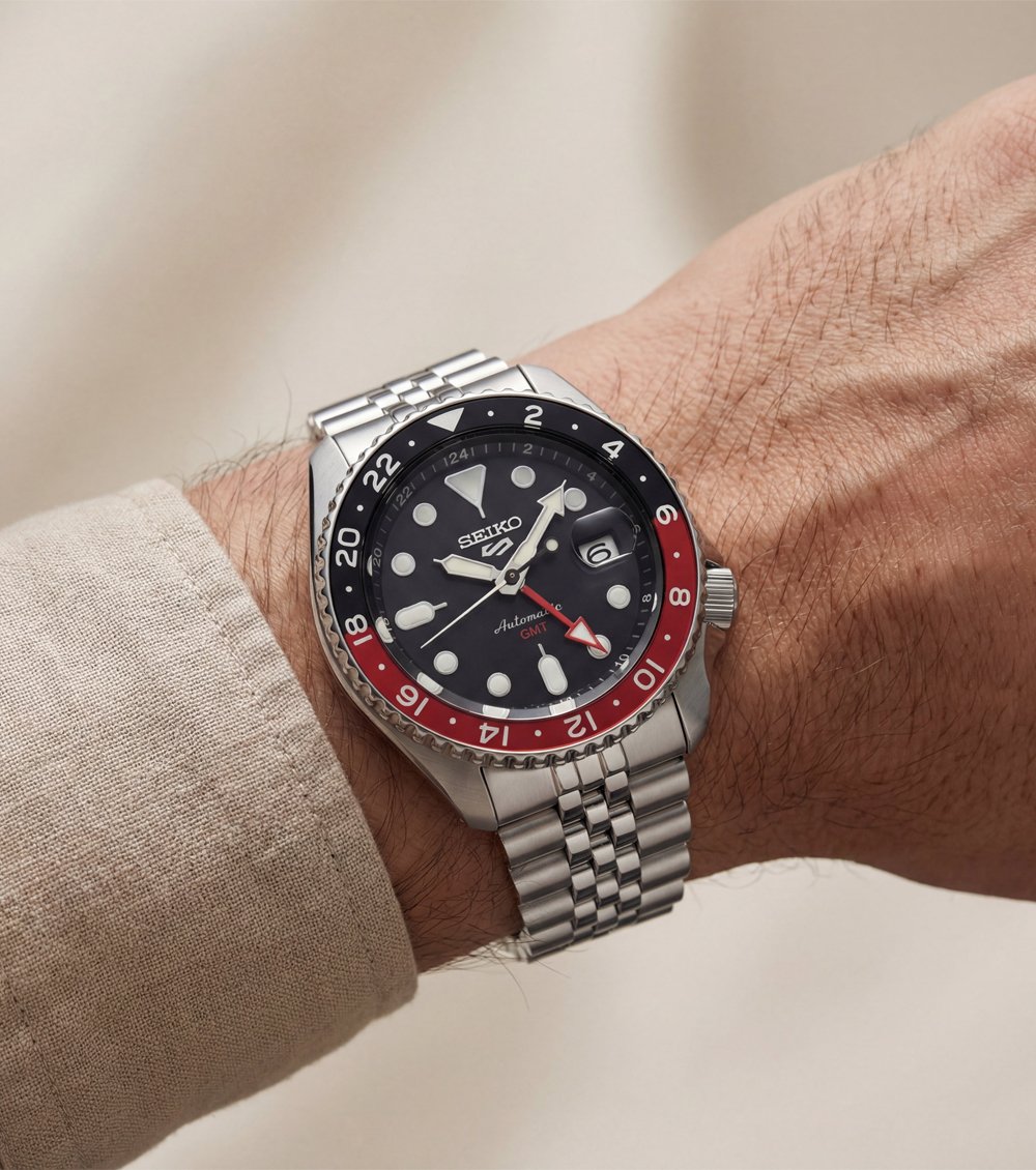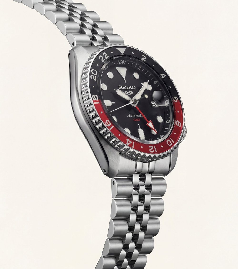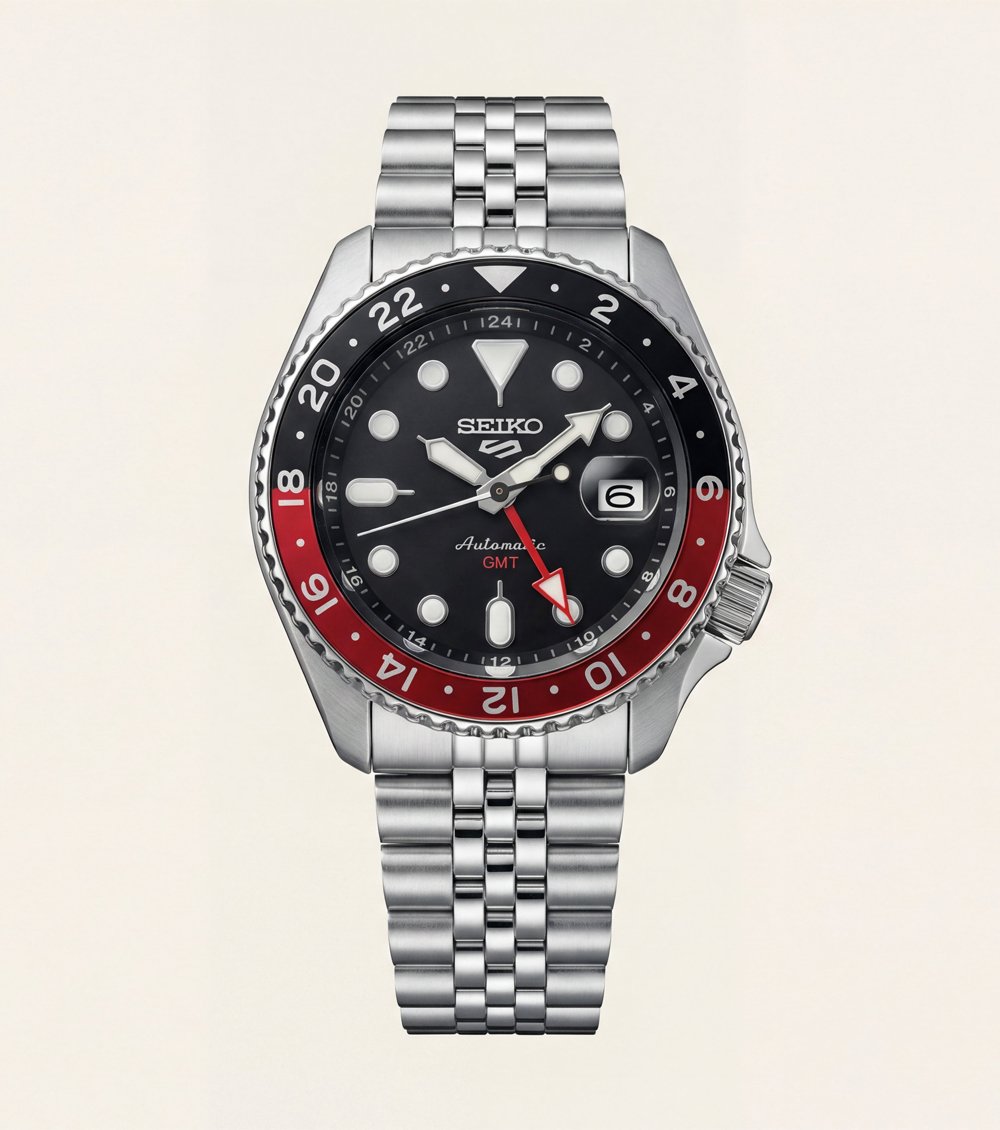This bold automatic GMT watch features a deep black dial paired with a striking red and black 24-hour bezel, delivering a powerful and sport-driven wrist presence. The contrasting bezel design enhances second time zone readability while adding a dynamic edge to the overall aesthetic.