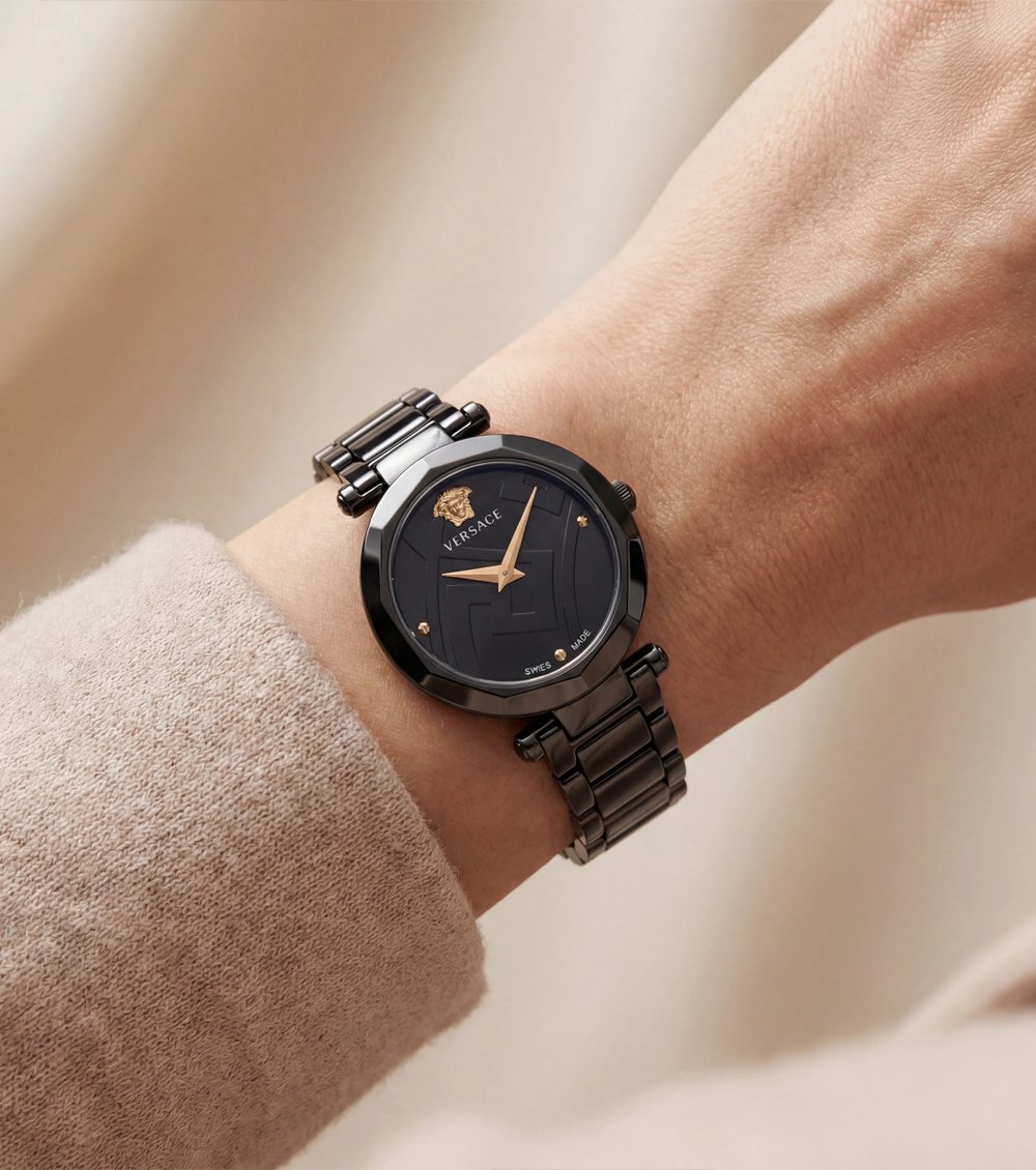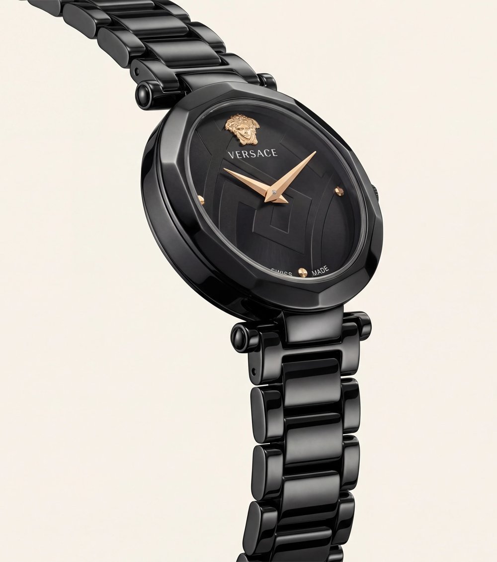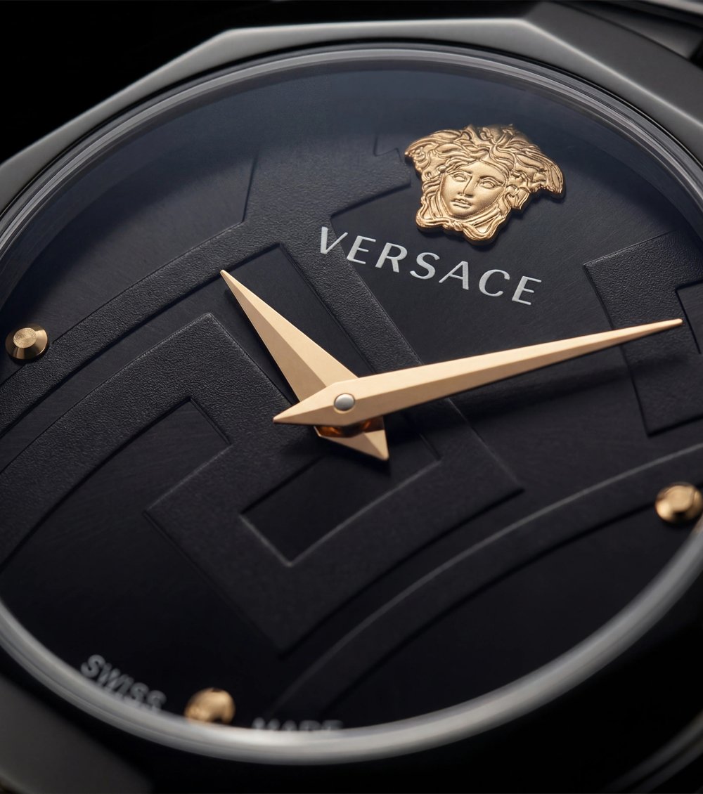At the center lies a striking textured black dial, designed with subtle geometric patterns that add depth and dimension to the watch face. The dial is accented by a signature Medusa-inspired emblem at the 12 oโclock position, representing strength, luxury, and timeless fashion heritage.