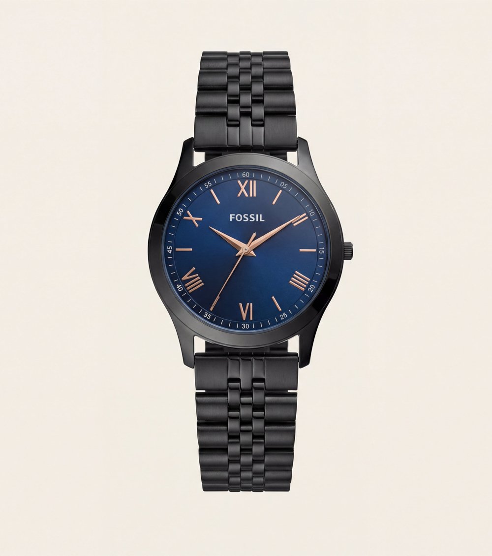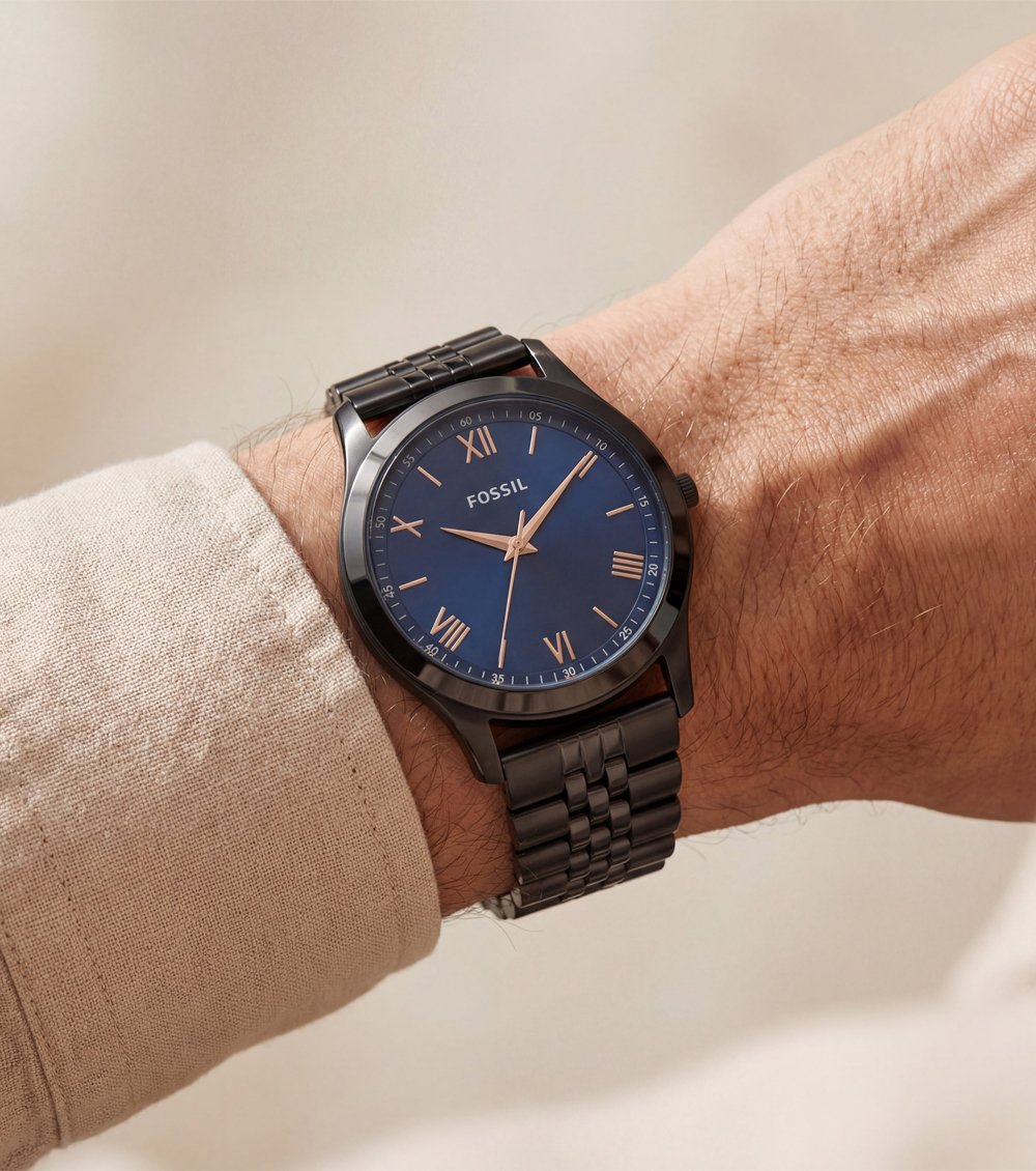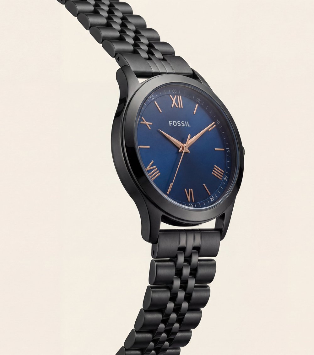 The dial features a rich blue finish enhanced by elegant Roman numeral accents and slim baton markers, offering a balanced and timeless visual appeal. Rose gold-tone hands provide warm contrast against the dark dial, ensuring excellent readability while elevating the overall aesthetic.