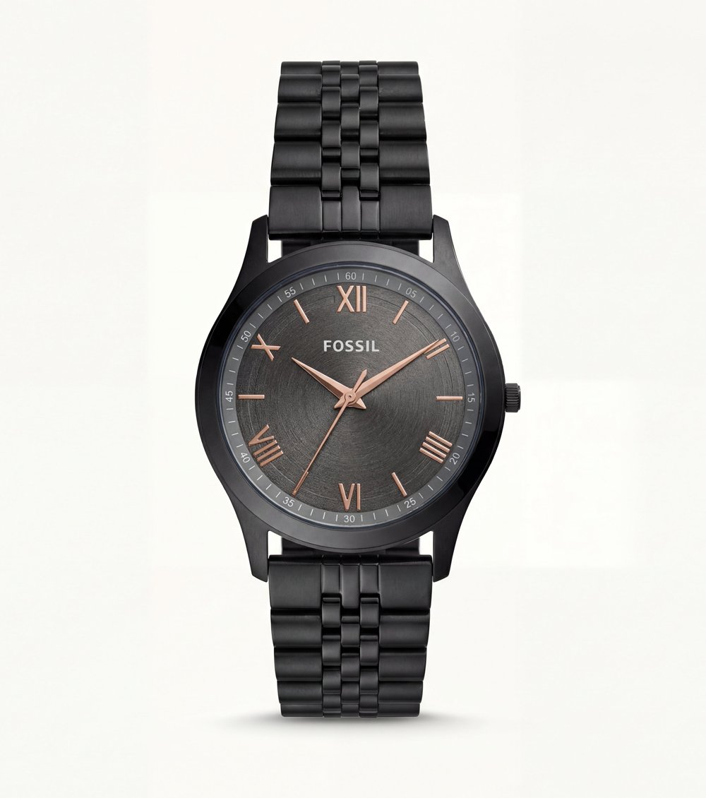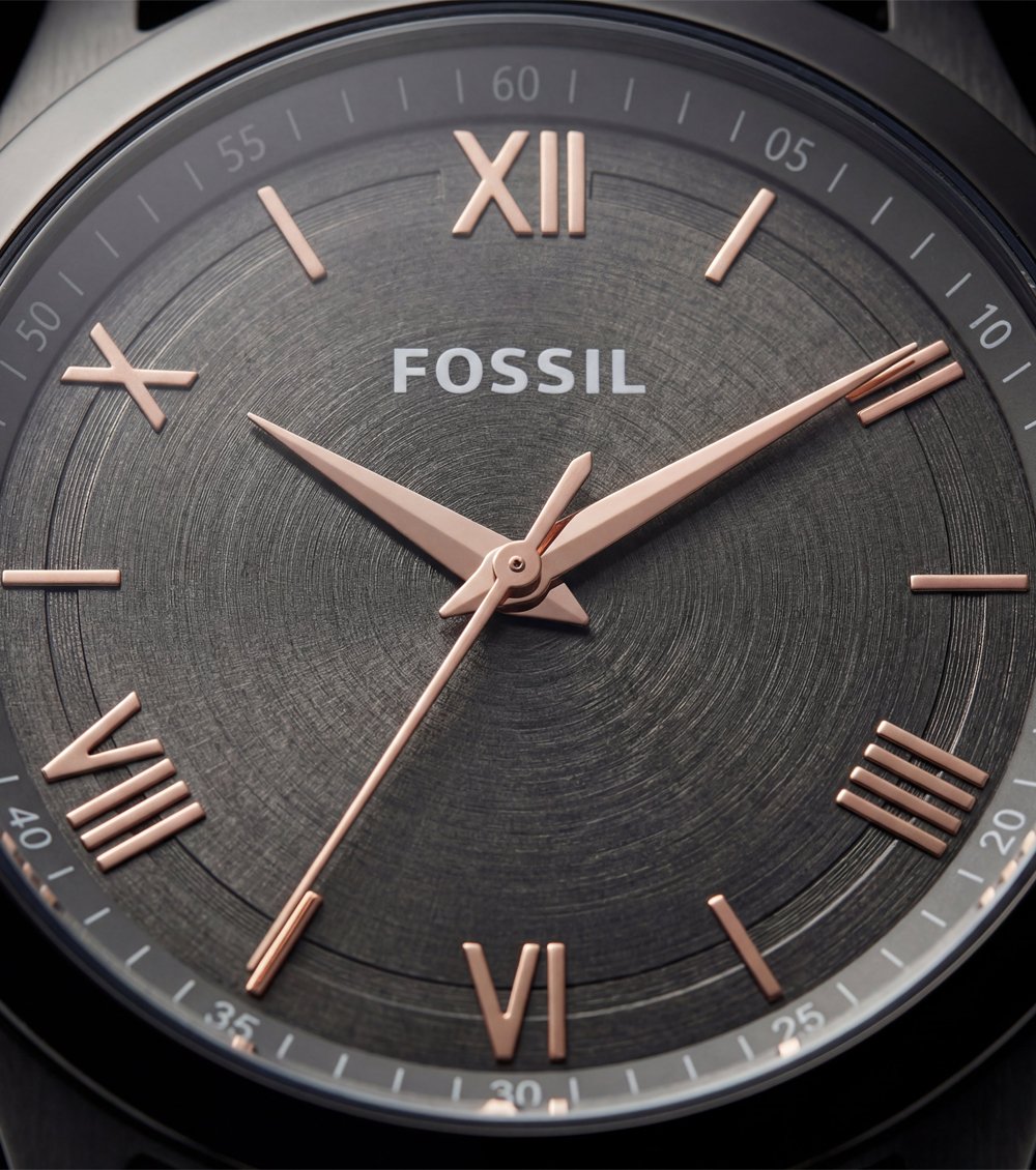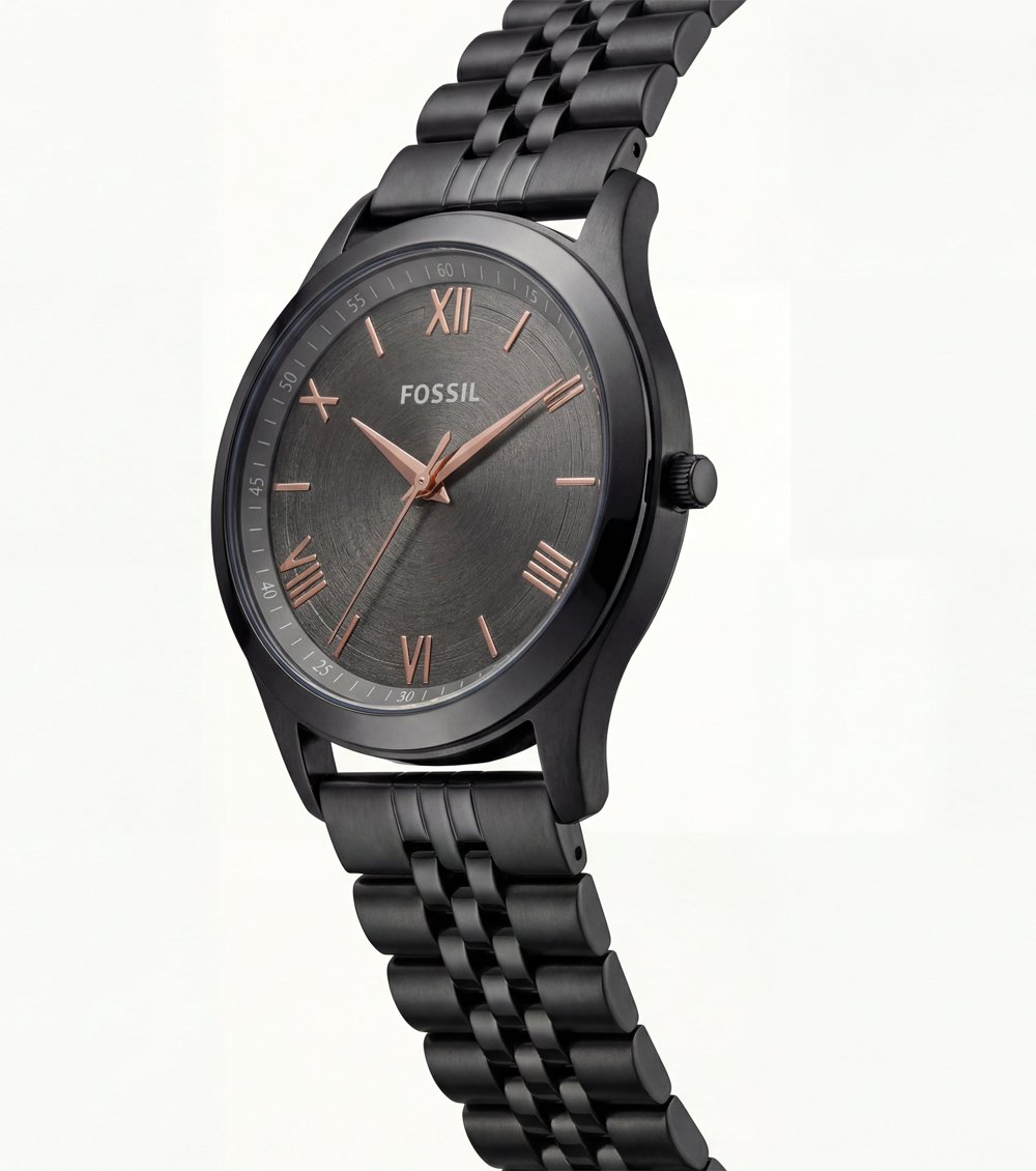 The dial features a subtle brushed charcoal finish enhanced by elegant Roman numeral accents and slim baton markers, offering a balanced and timeless aesthetic. Rose gold-tone hands add warm contrast against the dark surface, ensuring clear readability while elevating the overall visual appeal.