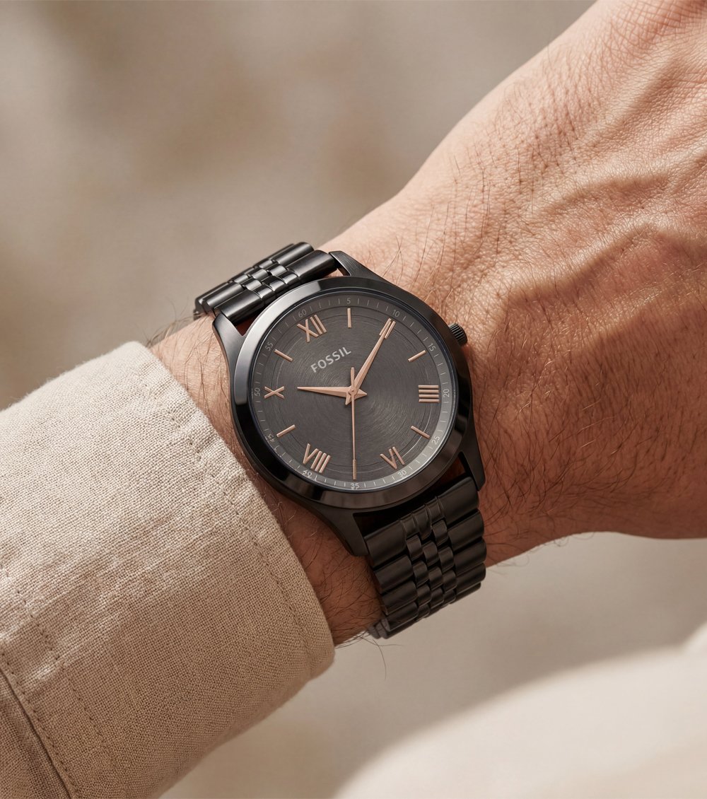 Finished in full black stainless steel, the bracelet reinforces the watchรขโ‚ฌโ„ขs contemporary character while providing durability and all-day comfort. Designed for individuals who appreciate classic detailing paired with strong monochrome styling.