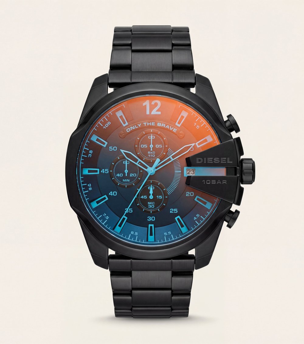 This bold Men’s chronograph watch showcases a striking dual-tone gradient dial that blends deep blue with vibrant orange for a powerful, modern look. The oversized round case and solid black steel bracelet give it a strong wrist presence, while the multi-subdial chronograph layout adds both functionality and sport appeal.