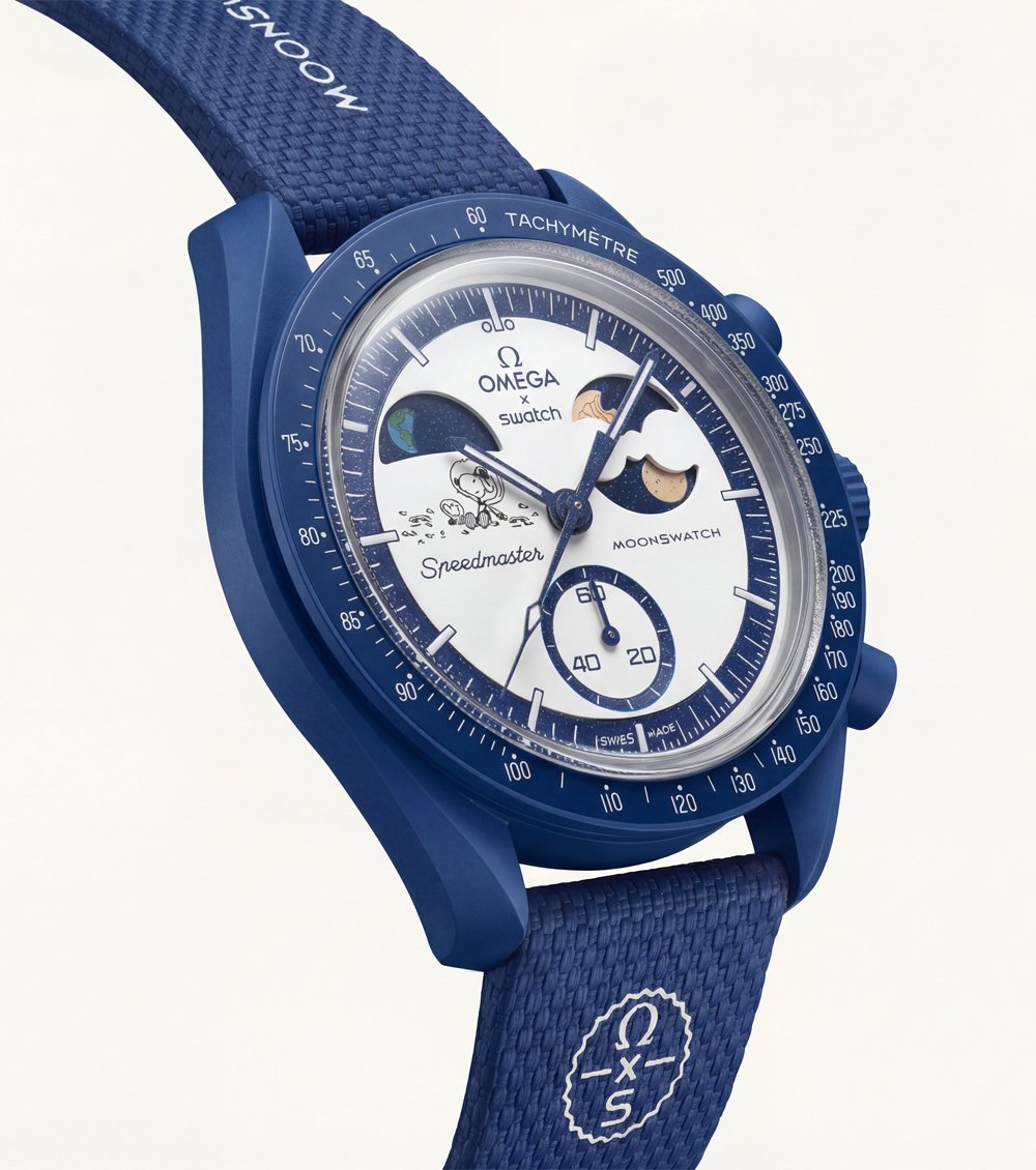 This blue moon chronograph watch features a unique space-inspired dial with artistic moon graphics, giving it a bold and modern character. The matte blue case is paired with a tachymeter bezel for a sporty and performance-driven look. Its chronograph sub-dials add functional detailing, while the fabric strap ensures lightweight comfort for daily wear.