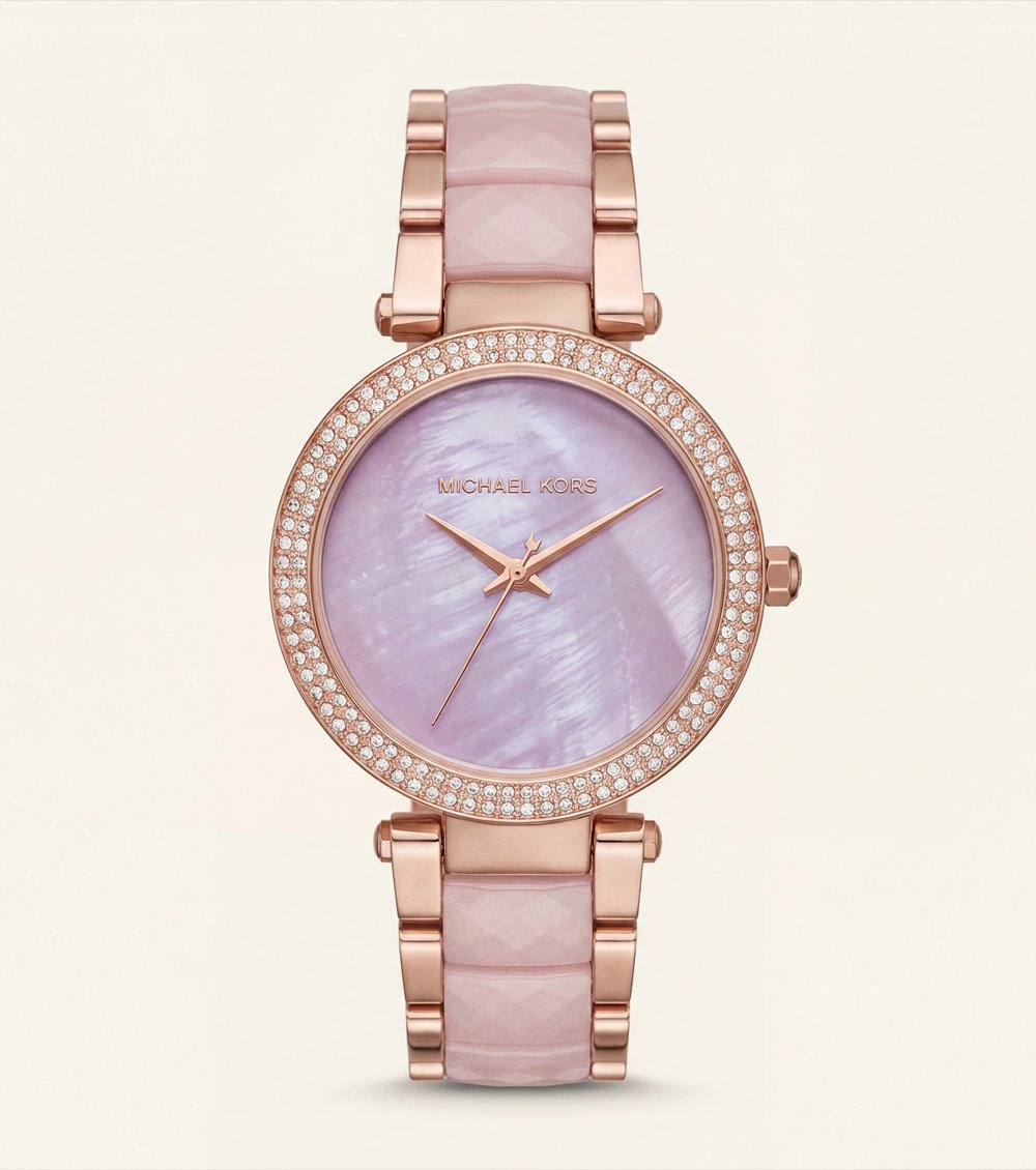 Encased in polished rose gold-tone stainless steel, the dial is framed by a fully crystal-set bezel that delivers elegant sparkle without overpowering its soft aesthetic. The matching rose gold hands maintain a clean, minimal face while enhancing the warm glow of the overall design.