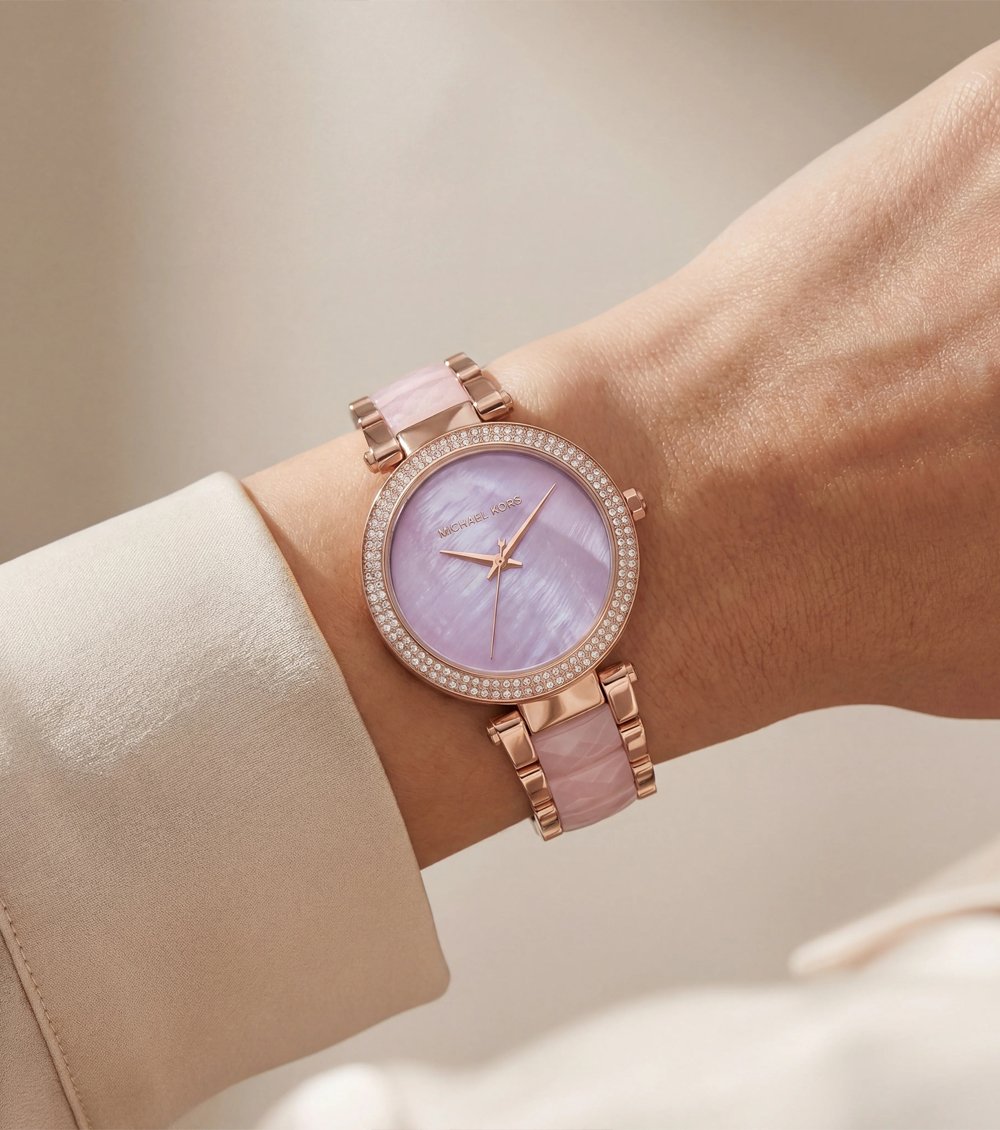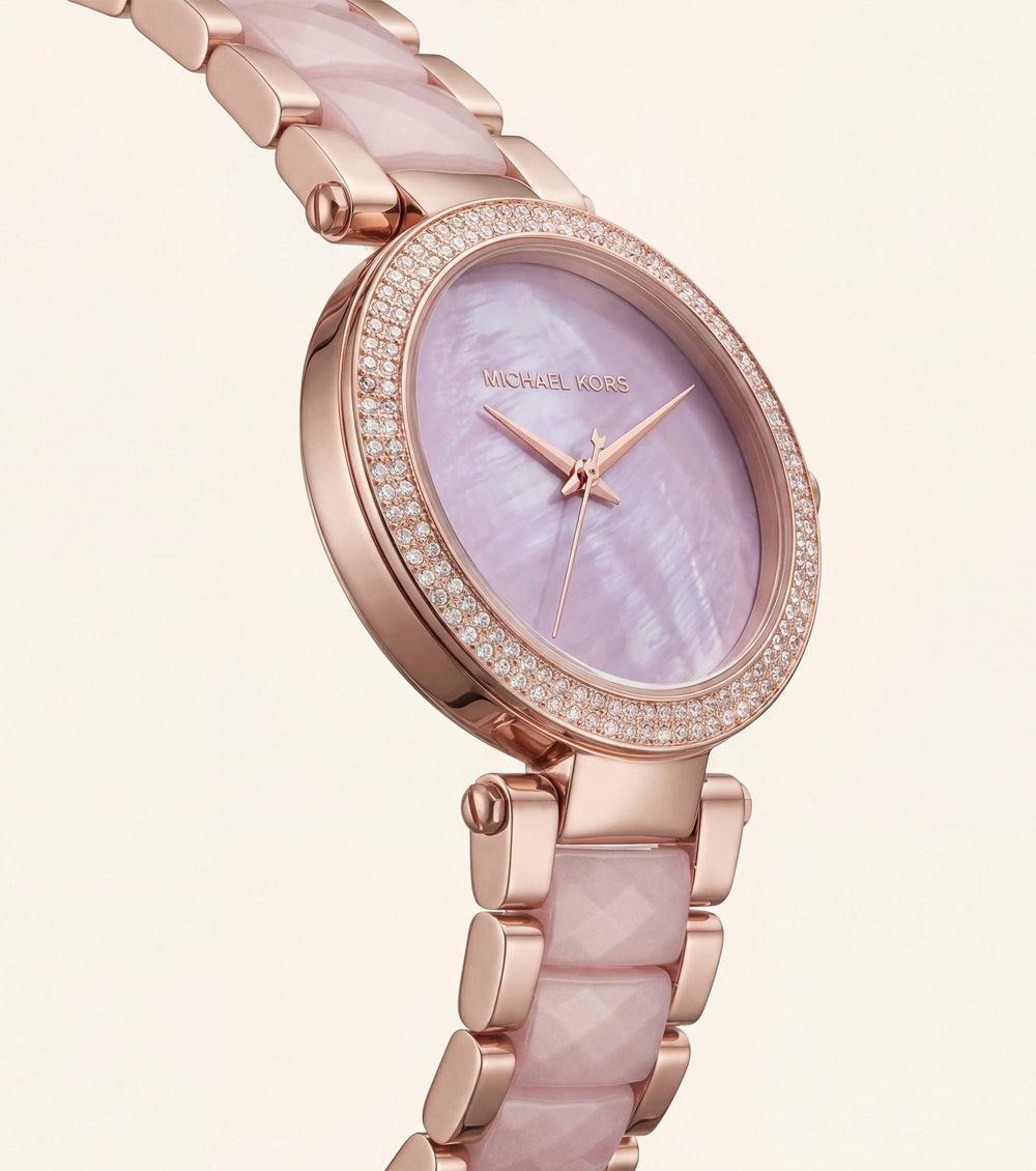 This refined timepiece captures delicate sophistication with its luminous blush mother-of-pearl dial, reflecting subtle waves of light for an ethereal, graceful finish.