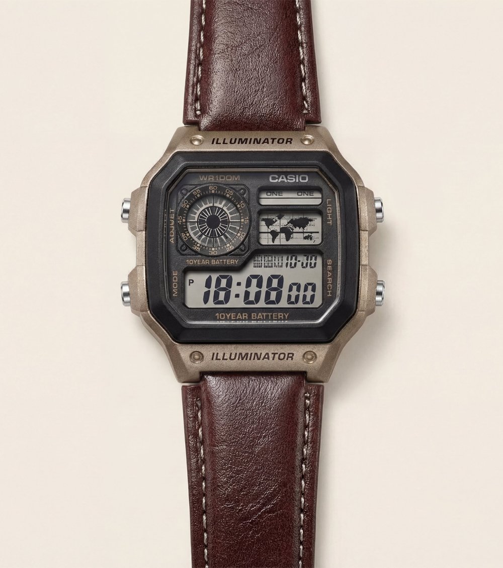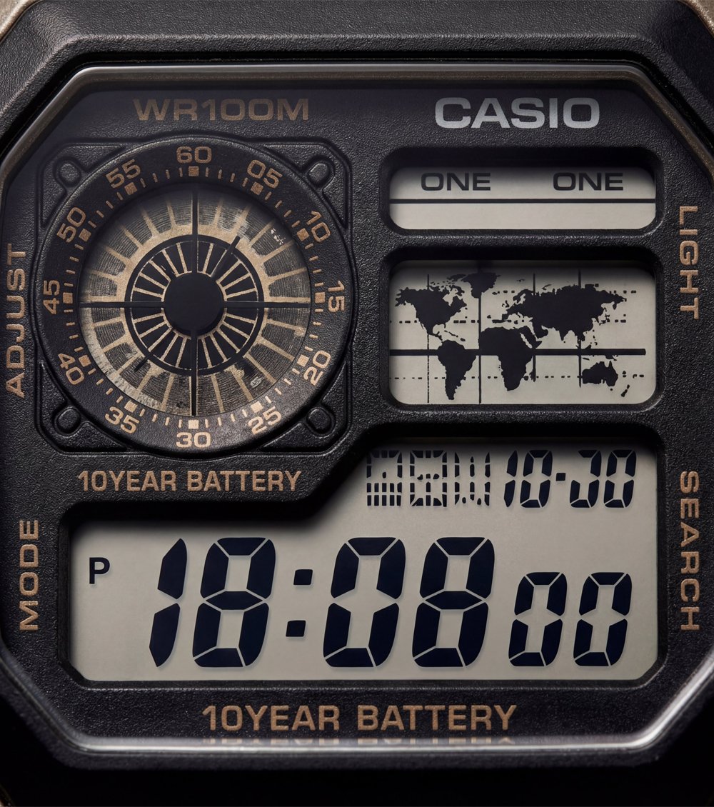 The multi-display digital layout provides clear time visibility along with a world-time map indicator, making it ideal for travel and everyday use. Well-defined sections on the display enhance readability, while the solid case construction adds durability and character.