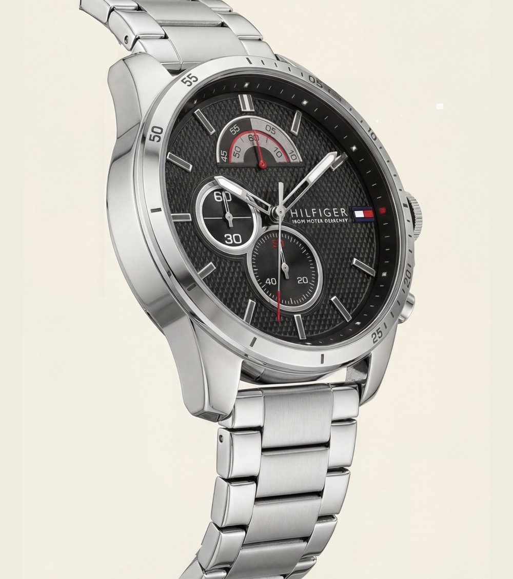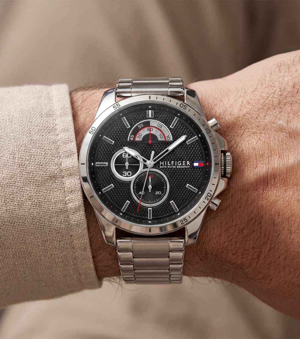 The multi-subdial chronograph layout enhances functionality and visual balance, accented by subtle red highlights that elevate the overall look. A fixed stainless steel bezel with minute markings frames the dial cleanly, giving the watch a confident and versatile character suitable for daily wear and professional styling.