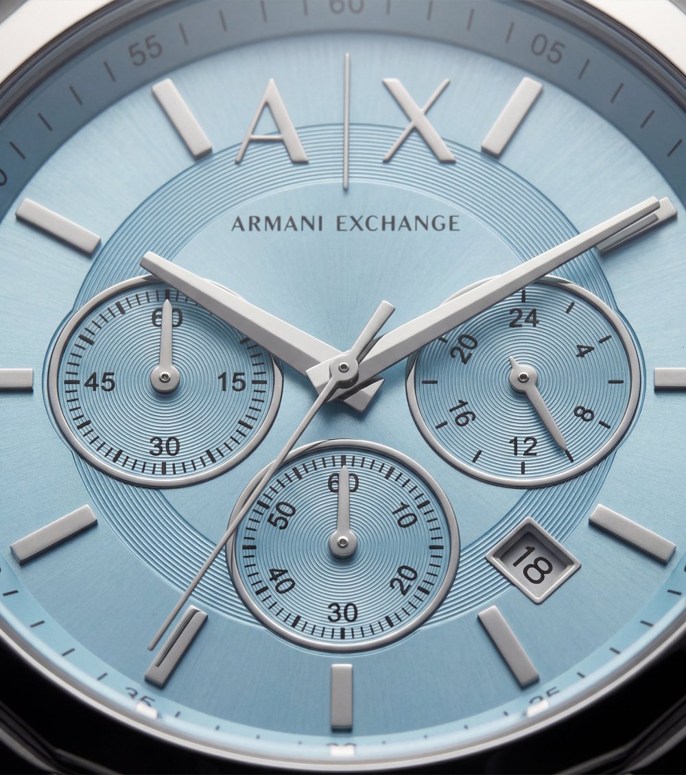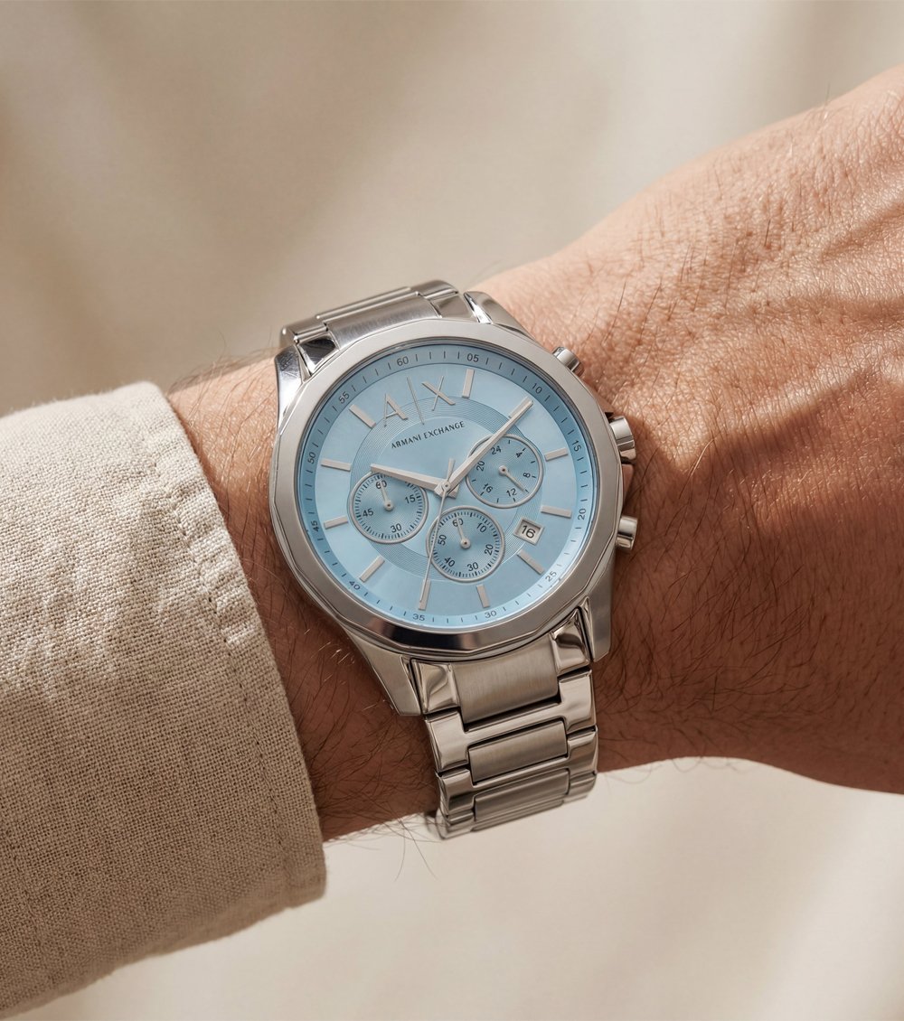 This elegant chronograph watch brings a fresh and modern aesthetic with a refined luxury touch. Crafted in polished stainless steel, the timepiece features a stunning ice blue dial with a smooth sunray finish that reflects light beautifully. Applied hour markers and sleek hands ensure excellent readability while maintaining a clean and contemporary look