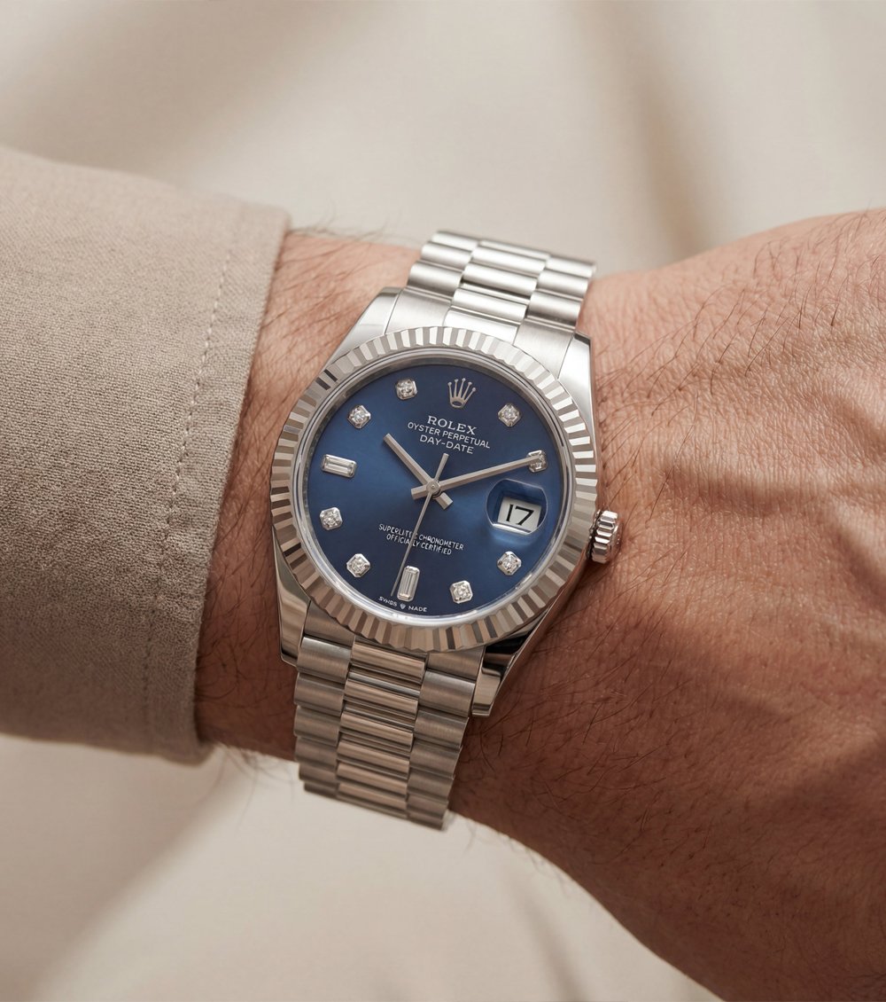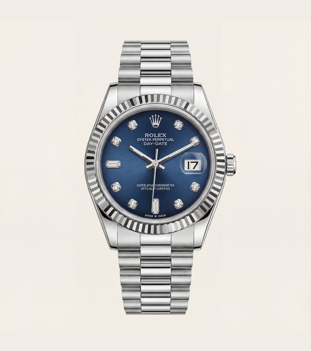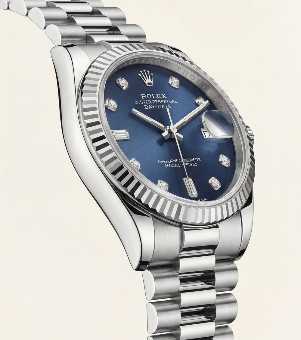 A fluted silver bezel surrounds the dial, adding a signature luxury touch that elevates the overall design. The day display at the top and date window at the side provide everyday practicality while maintaining an elegant aesthetic. Diamond-set markers enhance the dial without overpowering its classic character.
