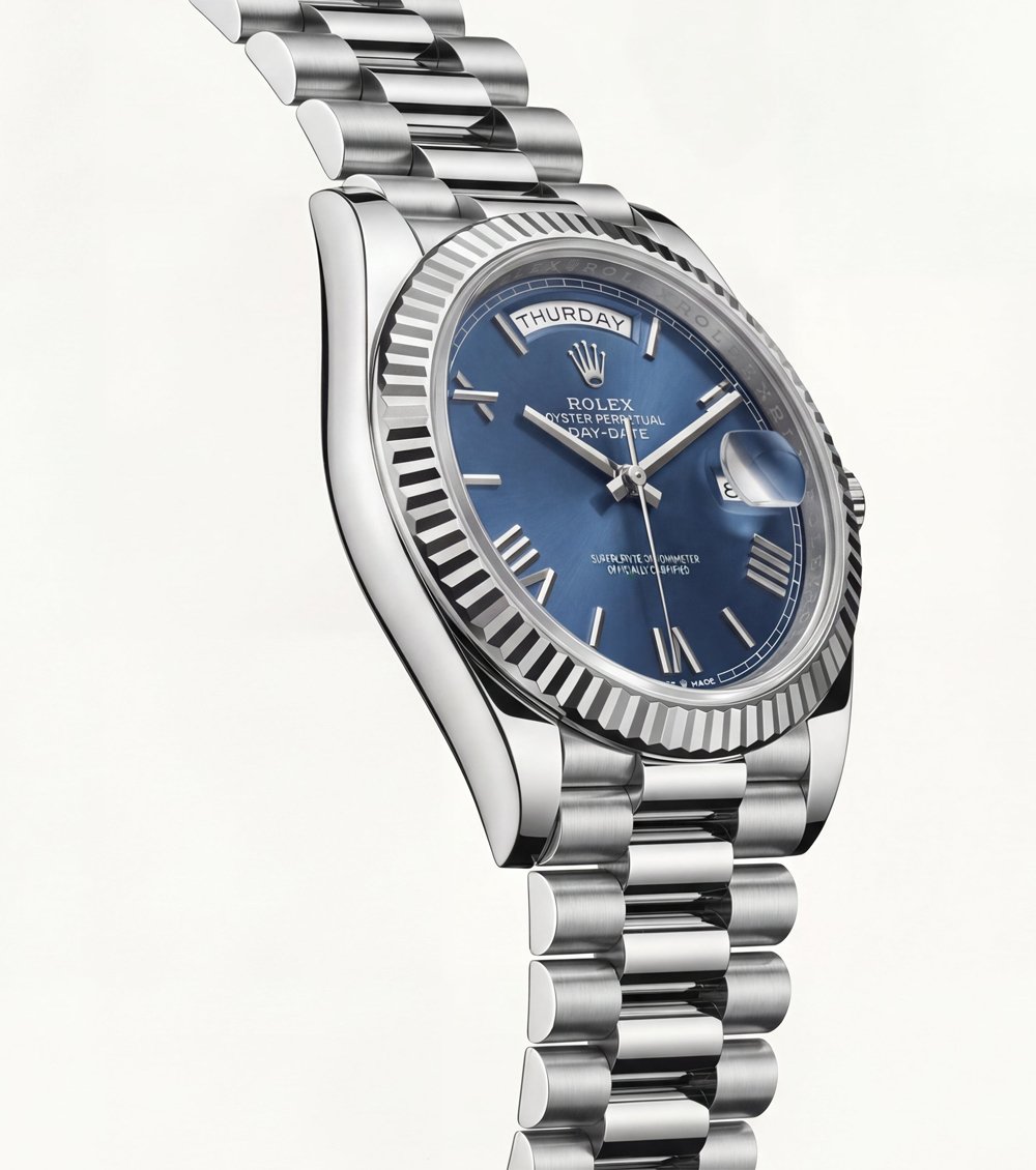 A signature fluted silver bezel frames the dial beautifully, enhancing its premium presence. The day display positioned at the top and the date window on the side offer everyday practicality without disturbing the balanced layout. Its refined proportions make it suitable for business, formal occasions, and daily wear.