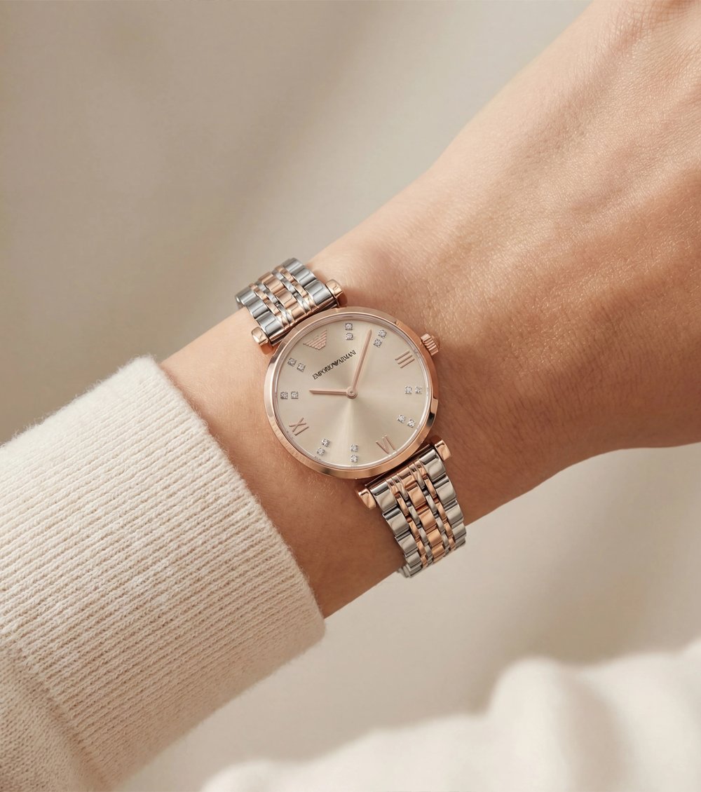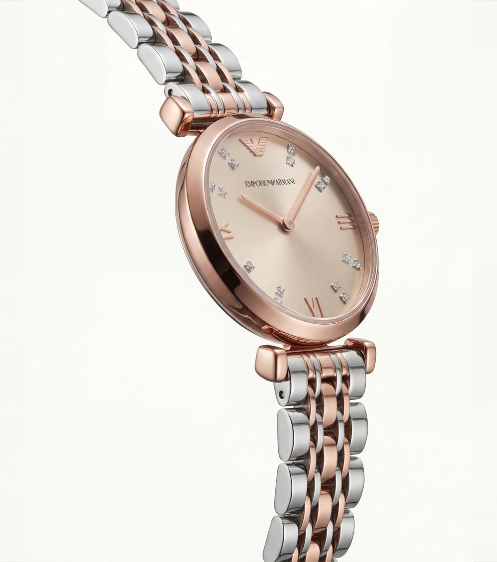 This two-tone luxury watch is designed for women who appreciate delicate brilliance without overpowering elegance. The soft champagne dial radiates a warm, luminous glow, beautifully complemented by rose gold-tone hands and detailing.