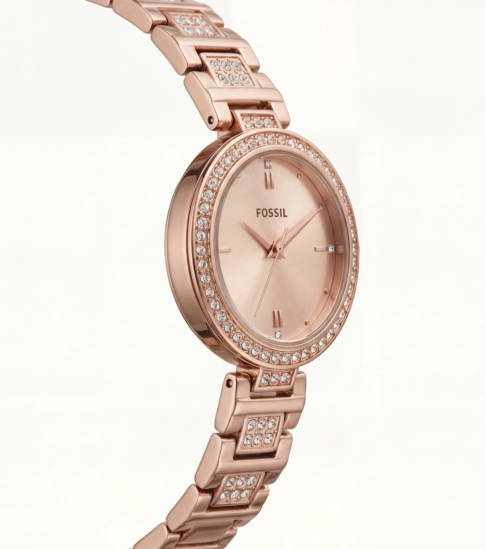 Encased in polished rose gold and surrounded by a crystal-studded bezel, this timepiece offers balanced brilliance without overpowering its refined aesthetic. The matching rose gold bracelet is detailed with crystal-accented center links, transforming it into a true jewelry-inspired statement.