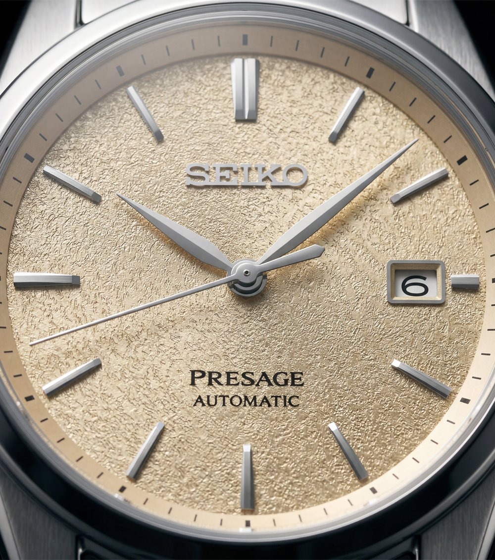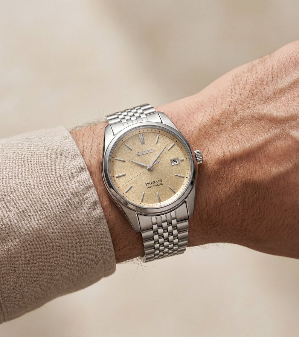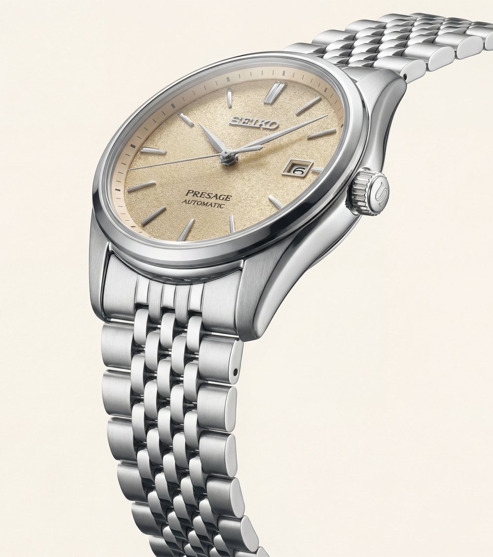 This refined classic timepiece showcases a warm champagne-tone textured dial paired with a polished stainless steel case and elegant multi-link bracelet. The subtle grain finish on the dial adds depth and sophistication, while sleek applied hour markers and slim metallic hands provide excellent readability.