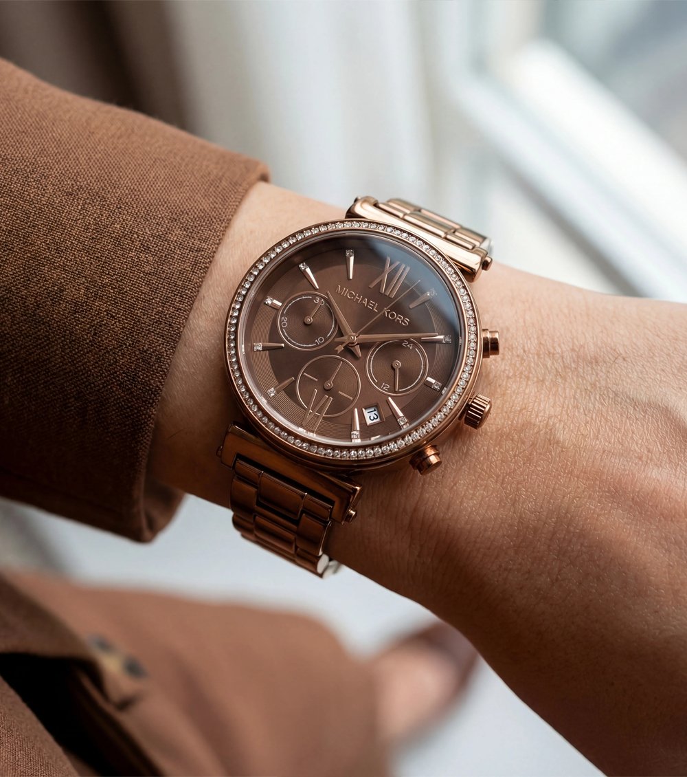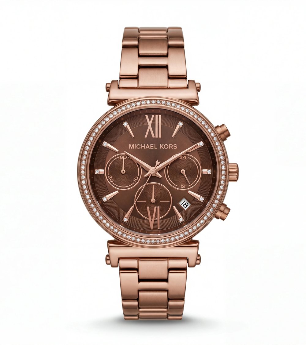 Warm, rich, and undeniably elegant โ this rose gold-tone chronograph watch is elevated by a deep chocolate brown sunray dial that adds dramatic depth to its refined silhouette. The crystal-studded bezel frames the dial with a soft brilliance, enhancing its luxurious presence without overpowering the design.