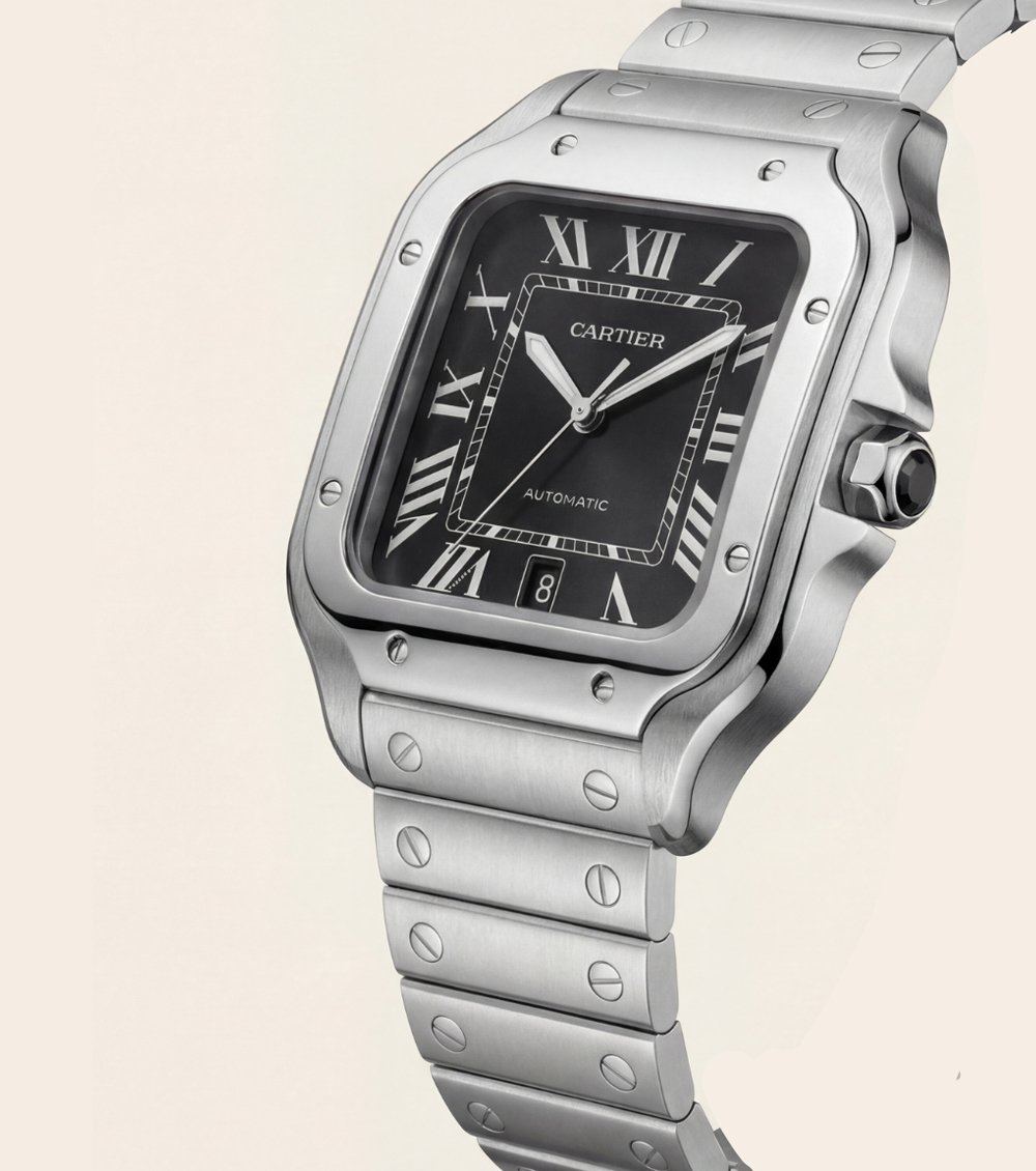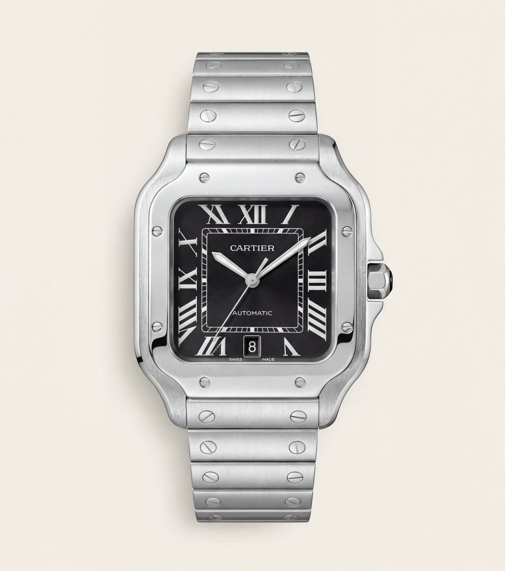 This refined automatic watch presents a clean square stainless steel case paired with an integrated solid-link bracelet, delivering a balanced blend of timeless elegance and modern structure. The deep black dial is enhanced with bold Roman numerals, creating a sharp contrast that ensures excellent readability and classic appeal.