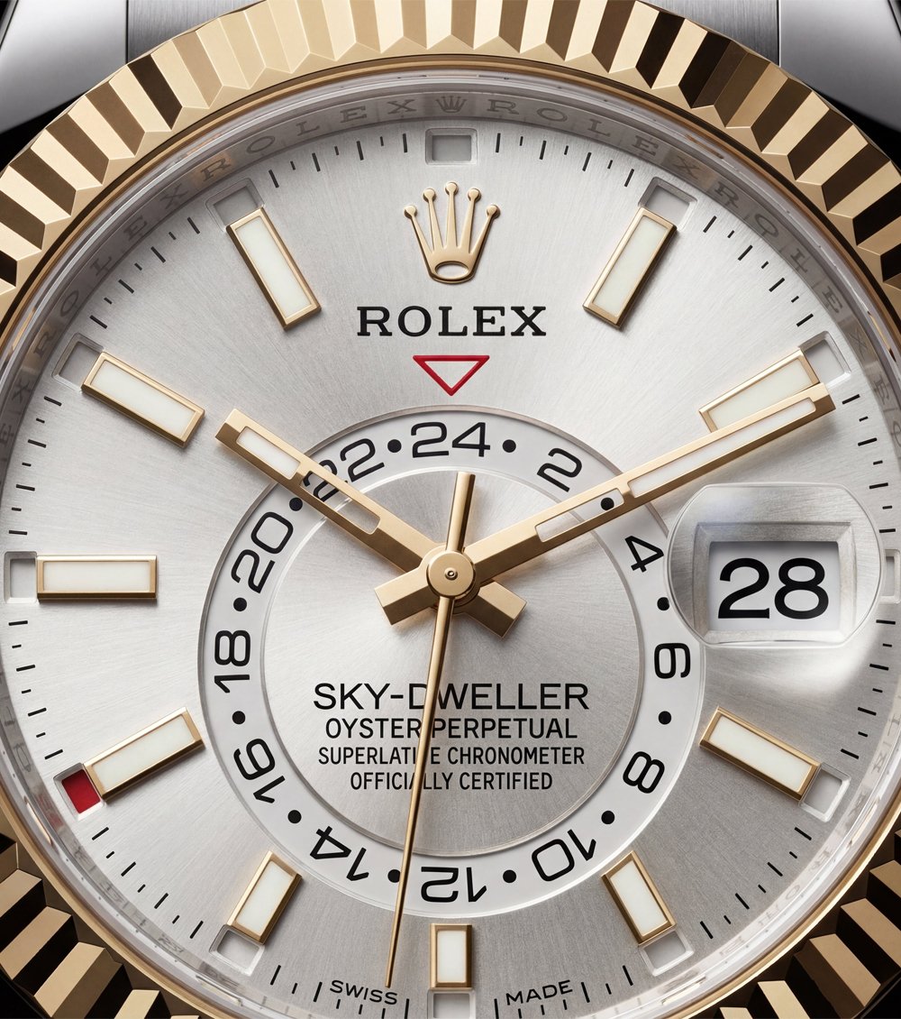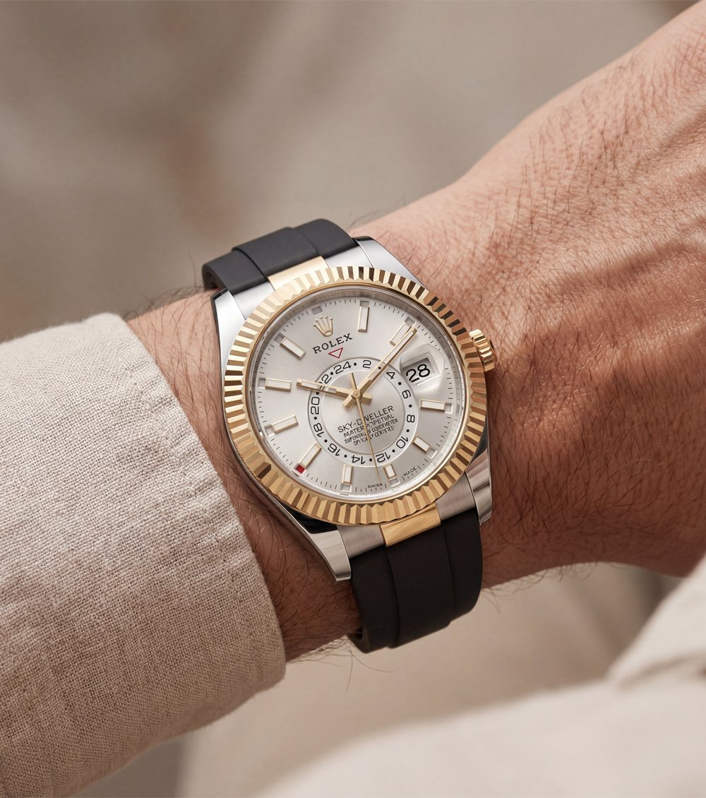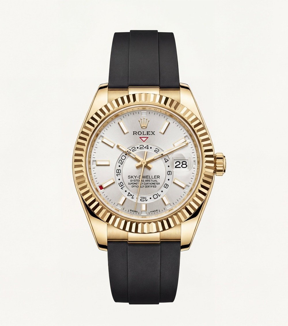 This luxury Men’s watch features a striking dual-tone case paired with a rich gold fluted bezel, creating a perfect balance of elegance and modern appeal. The refined white dial is designed with bold index markers, a clear date window, and a distinctive 24-hour inner ring that enhances both functionality and visual depth.