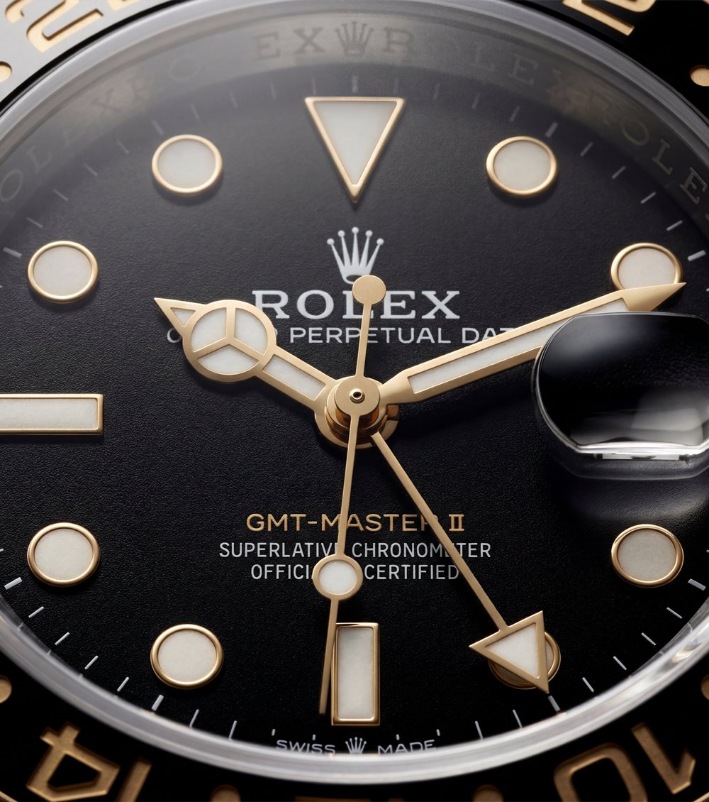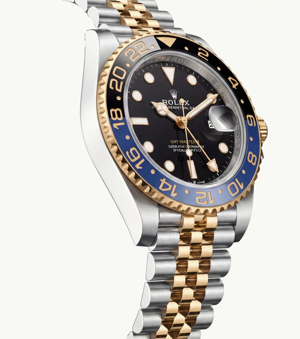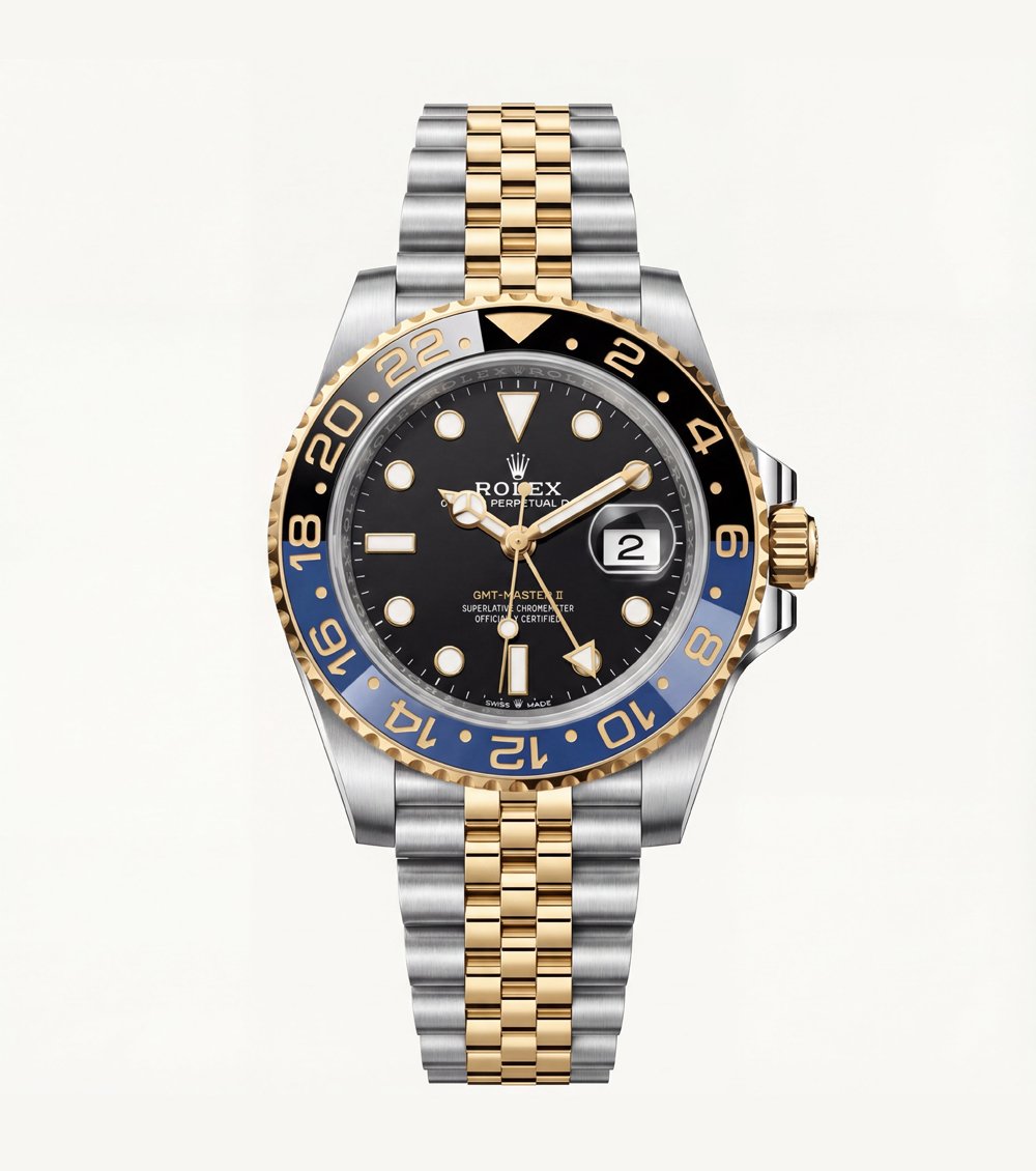 The two-tone stainless steel and gold bracelet adds a refined, premium finish while offering long-lasting durability and comfort. A dedicated GMT hand and 24-hour bezel allow easy tracking of multiple time zones, making this watch ideal for travelers and professionals alike.