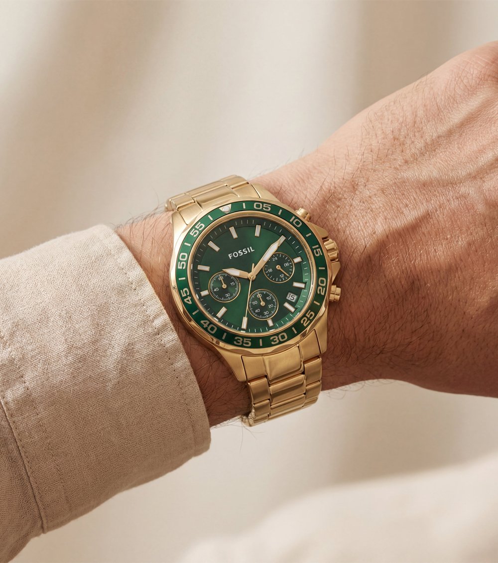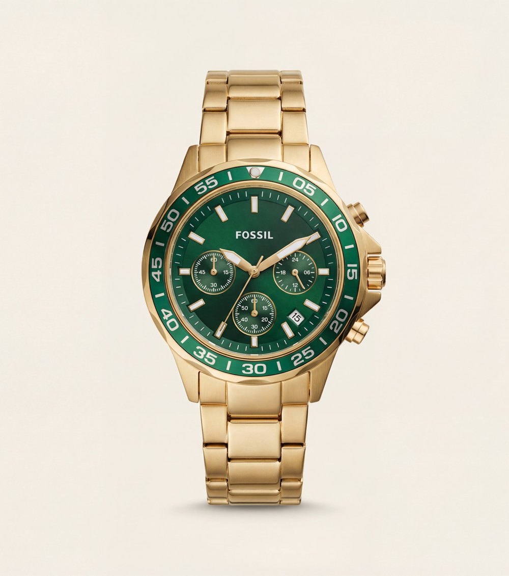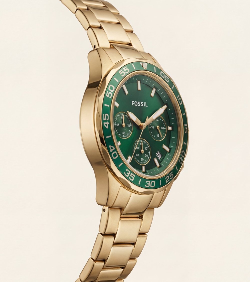 This emerald gold chronograph Men’s watch blends royal elegance with sporty power. The rich green sunray dial paired with a matching green sport bezel creates a bold and premium look, while the full gold-tone metal body adds a luxurious finish.