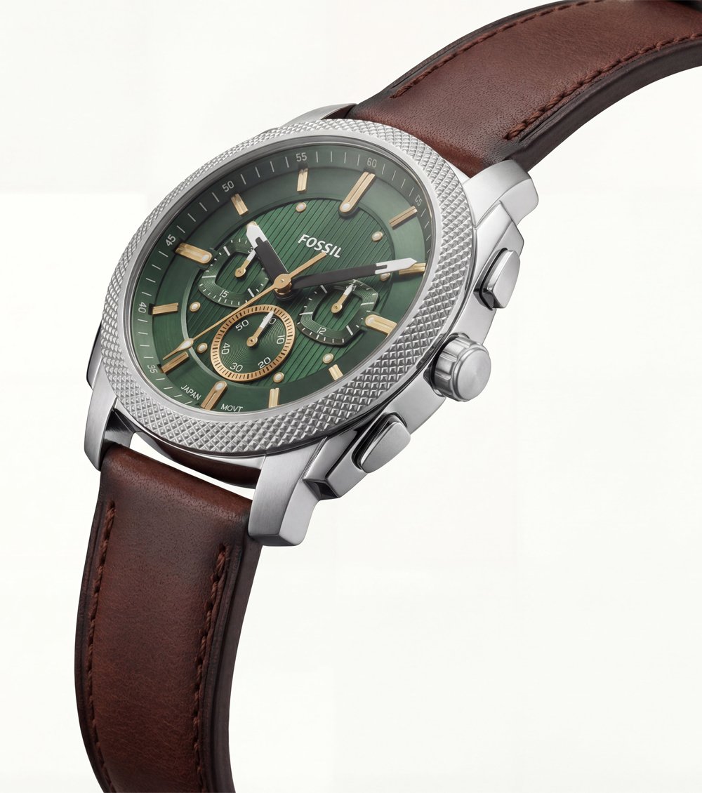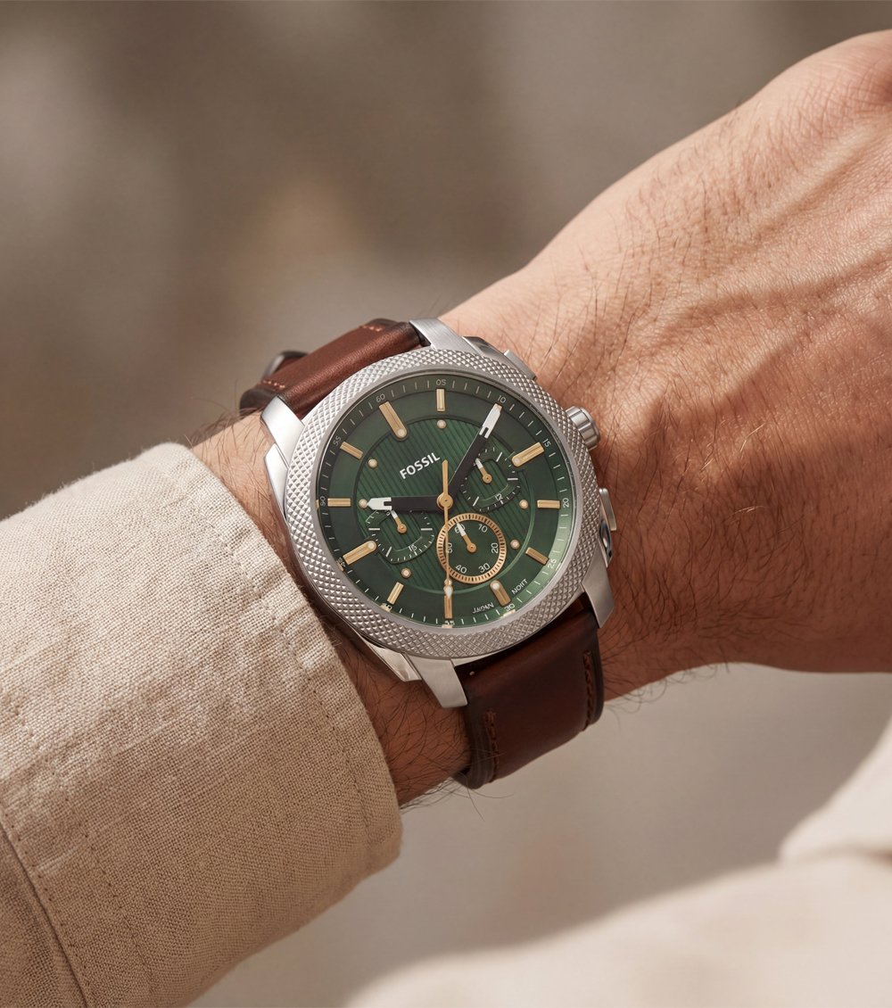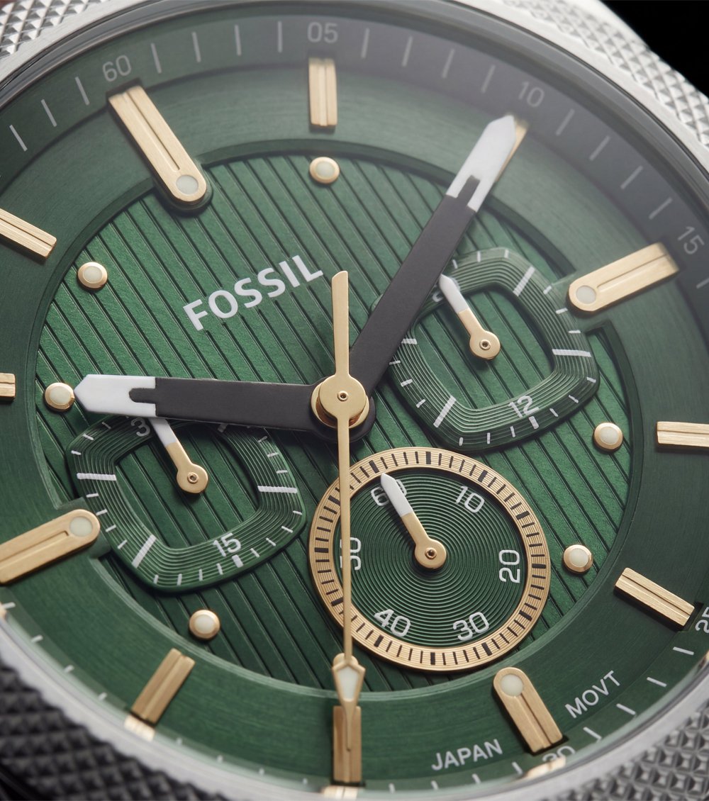This elegant chronograph watch features a rich emerald green dial paired with warm gold-tone accents, creating a refined yet bold visual appeal. The textured dial design adds depth and character, while the balanced multi-subdial layout enhances both functionality and aesthetics.