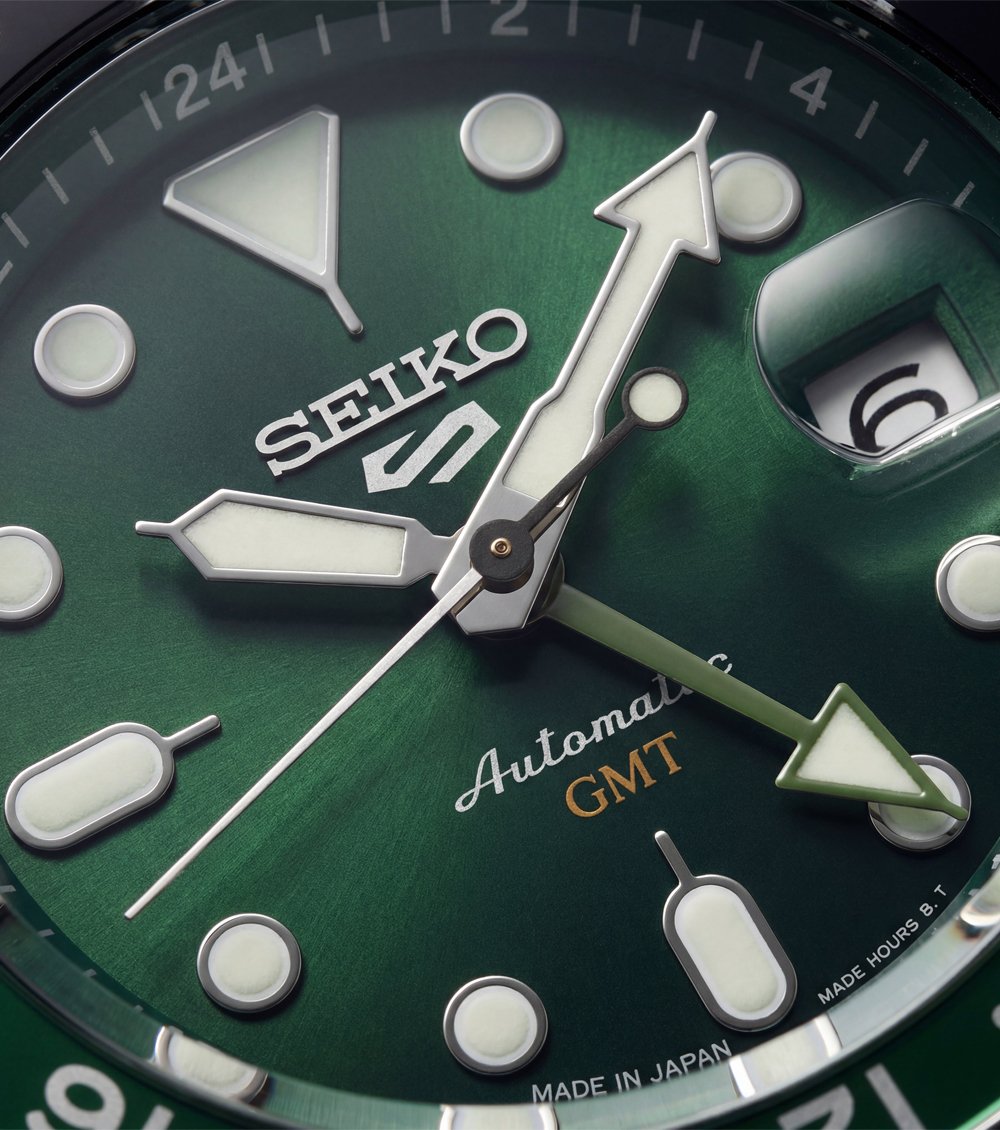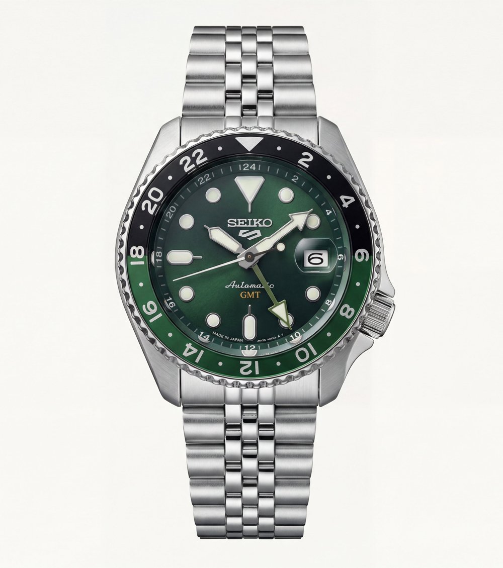 This striking automatic GMT watch features a rich emerald-green dial paired with a contrasting black and green 24-hour bezel, delivering a bold and travel-ready wrist presence. The vibrant green tone adds depth and character, while the dual-tone bezel enhances both functionality and visual appeal.