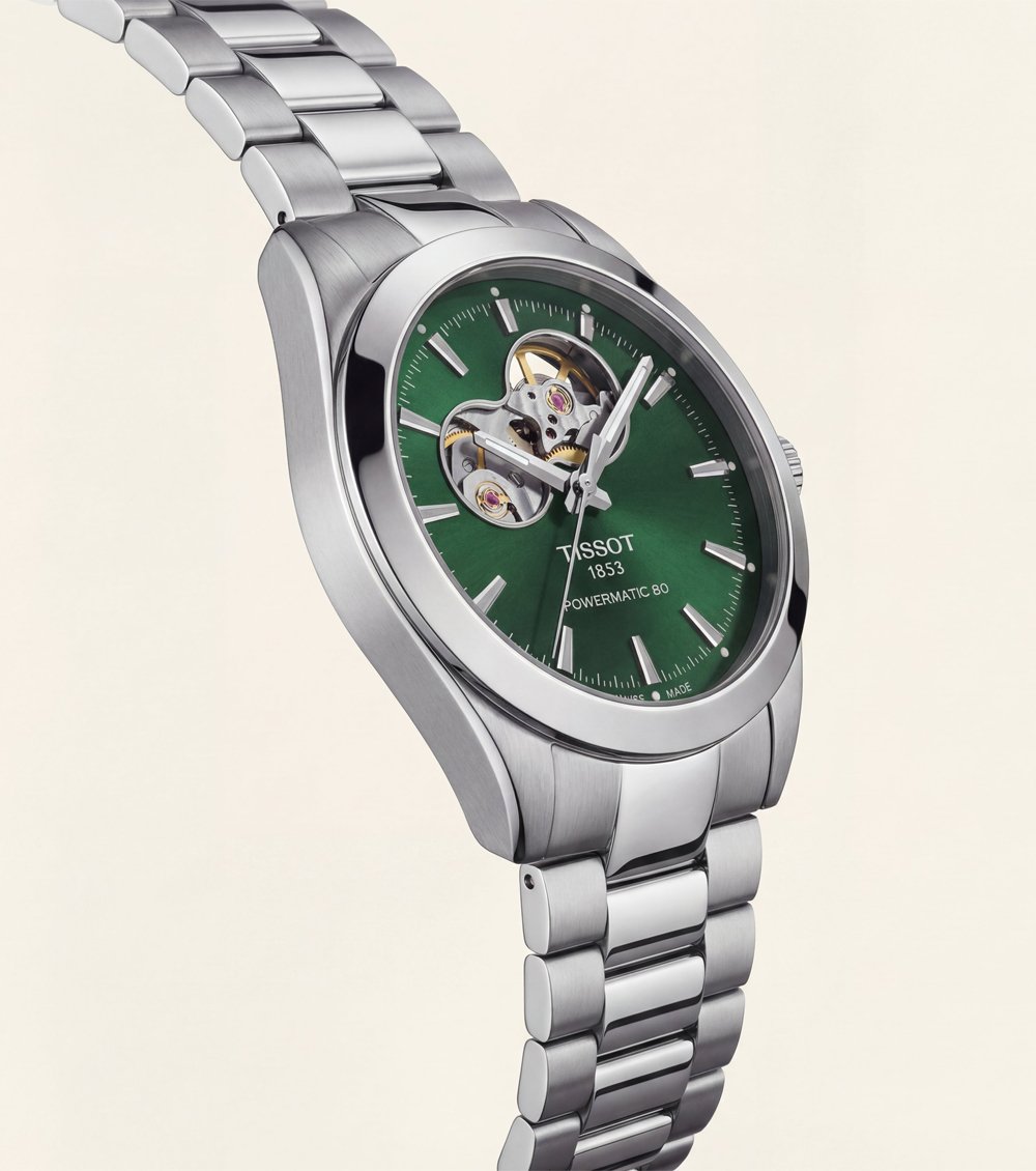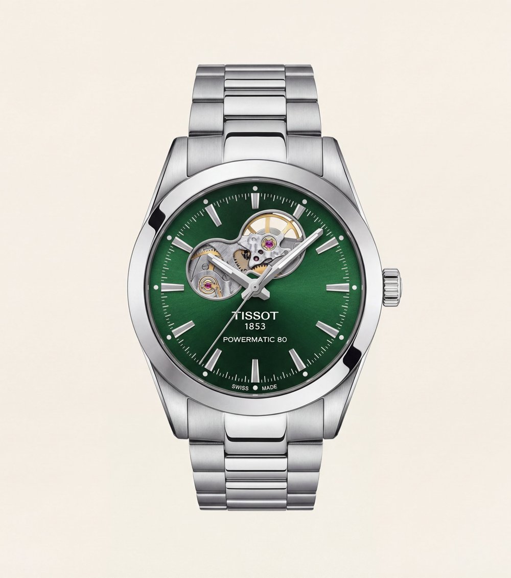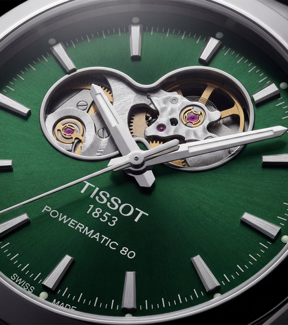 This elegant automatic watch features a rich emerald-green dial complemented by a refined open-heart design, offering a perfect blend of classic sophistication and mechanical appeal. The visible movement window adds depth and character while maintaining a clean, balanced dial layout.