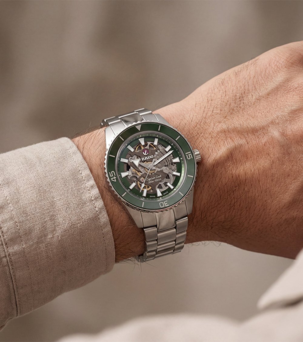 This striking automatic timepiece features a rich emerald-green rotating bezel paired with a fully exposed skeleton dial, creating a bold and refined wrist presence. The open-worked dial reveals the intricate mechanical movement beneath, delivering depth, motion, and a premium mechanical character inspired by classic dive-watch design.