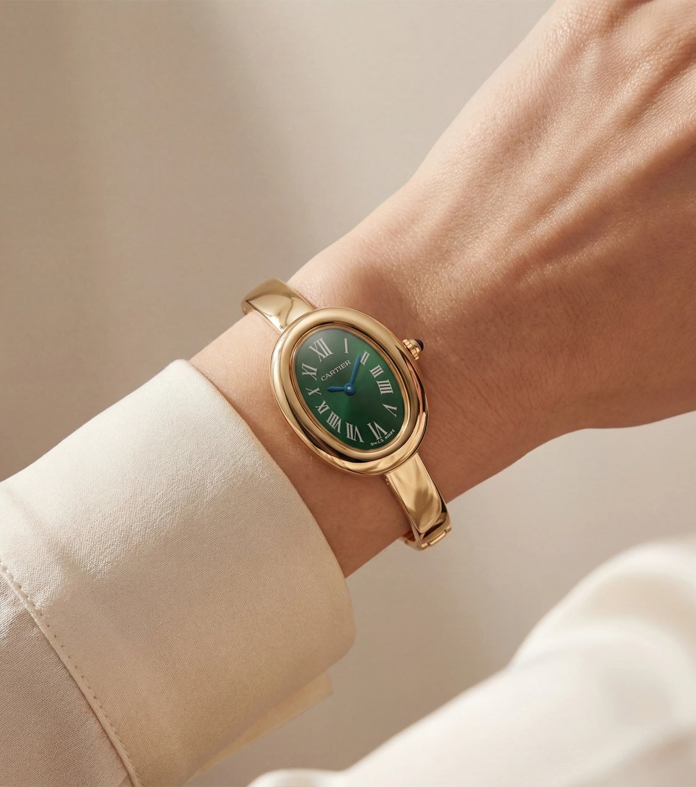 This oval luxury timepiece radiates classic sophistication with its rich emerald sunray dial, beautifully framed in a polished gold-tone case. The deep green dial captures light from every angle, creating a refined luminous effect that feels both bold and graceful.