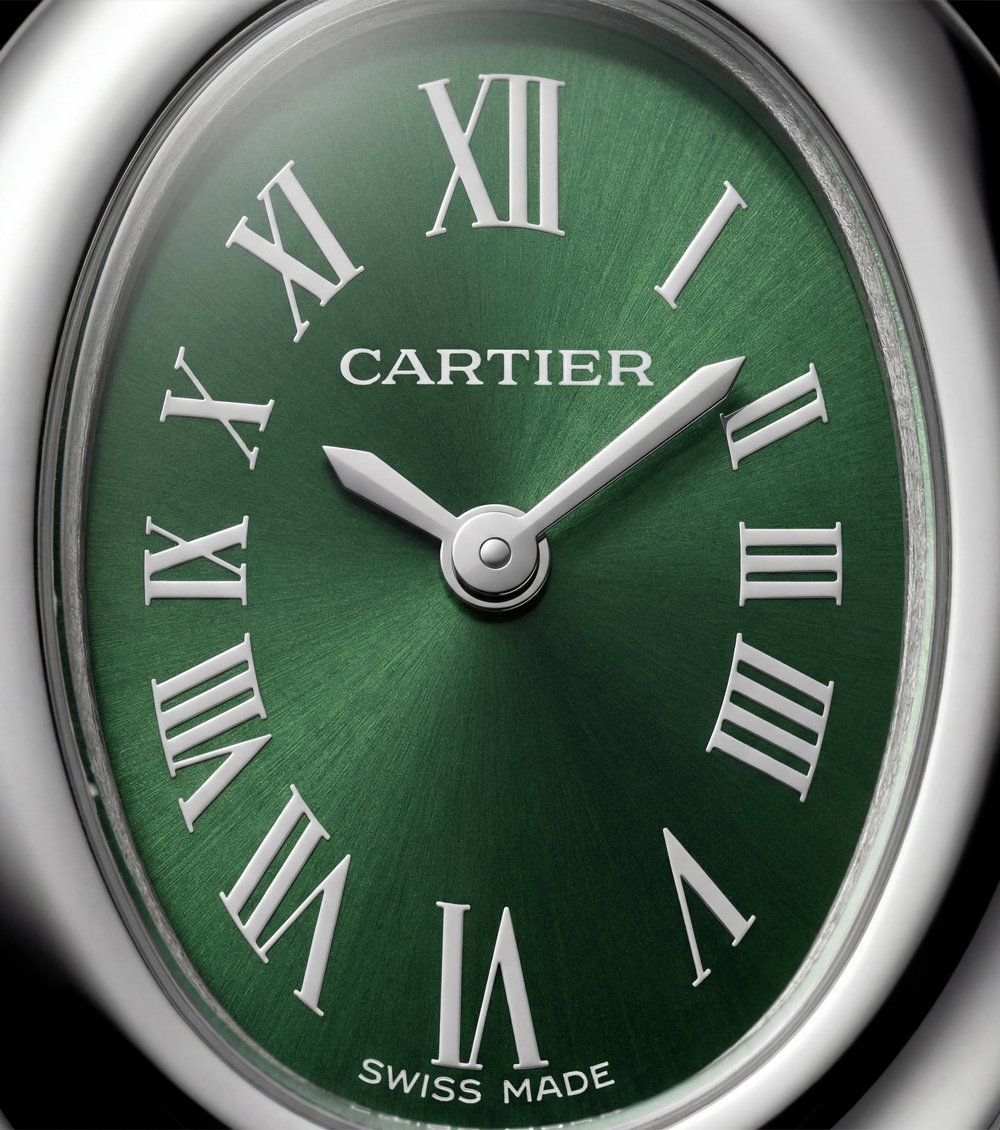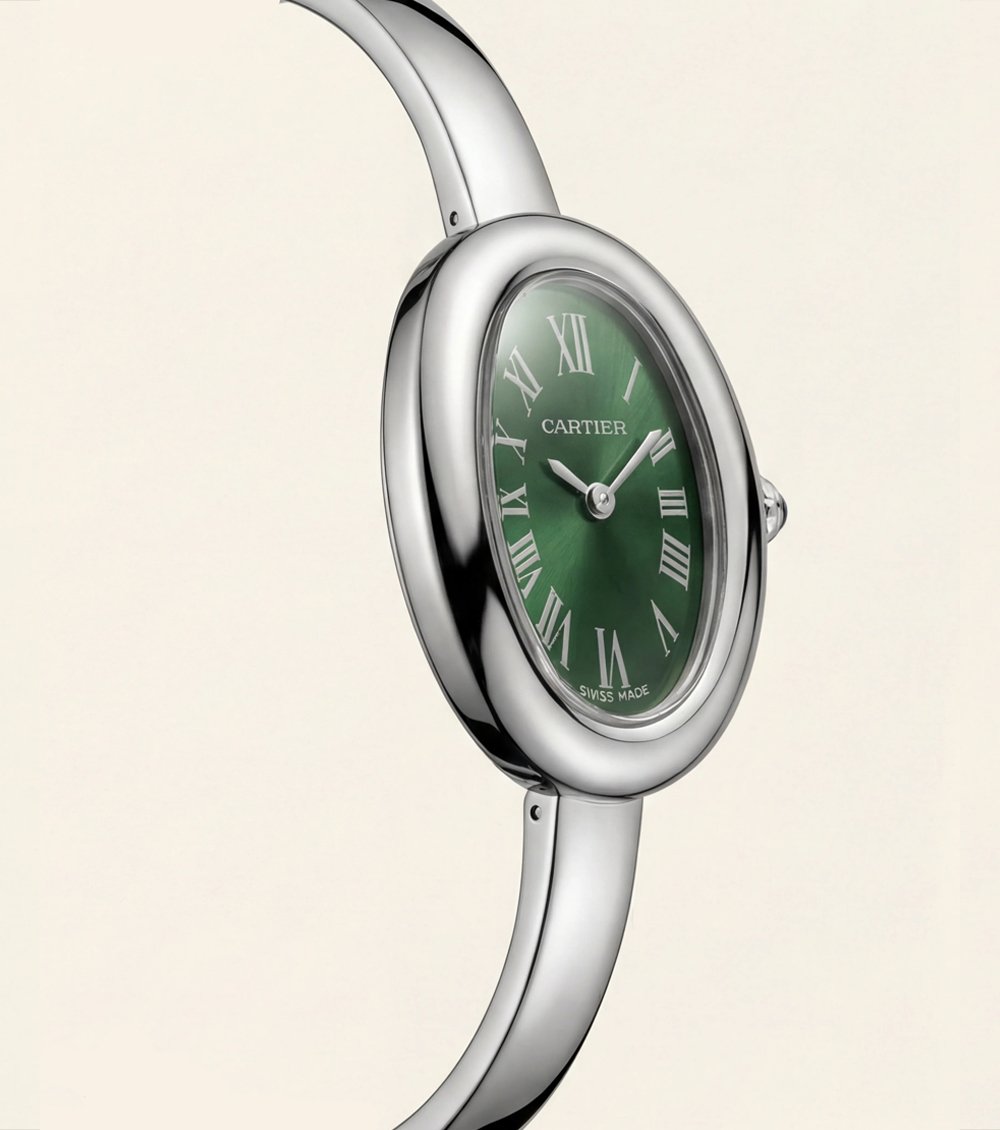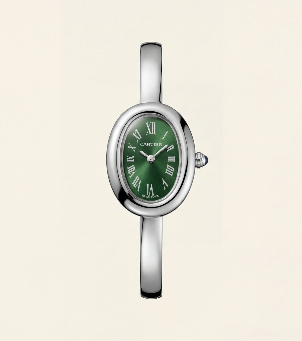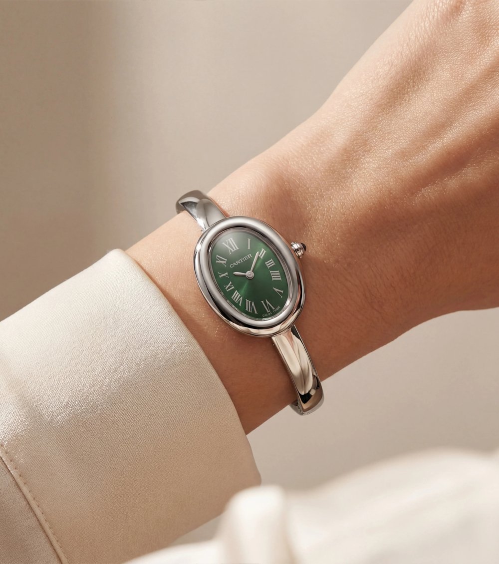 This elegant oval timepiece blends vintage charm with refined modern luxury. The high-polish silver-tone oval case embraces a rich emerald green dial, creating a striking yet sophisticated contrast.