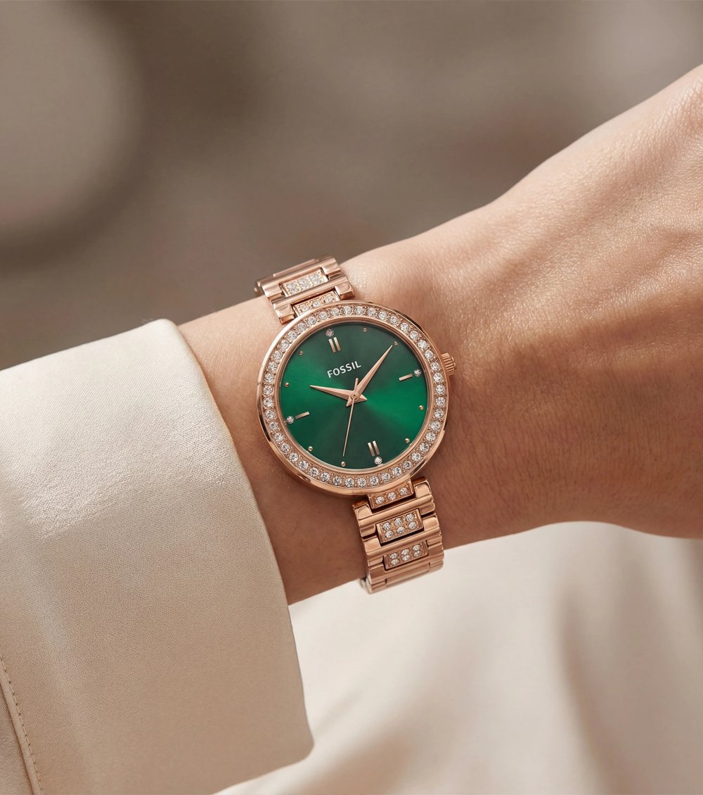 This emerald green luxury watch is crafted for women who embrace bold elegance. The deep sunburst green dial captures light with a silky glow, creating a captivating contrast against the warm rose gold case.