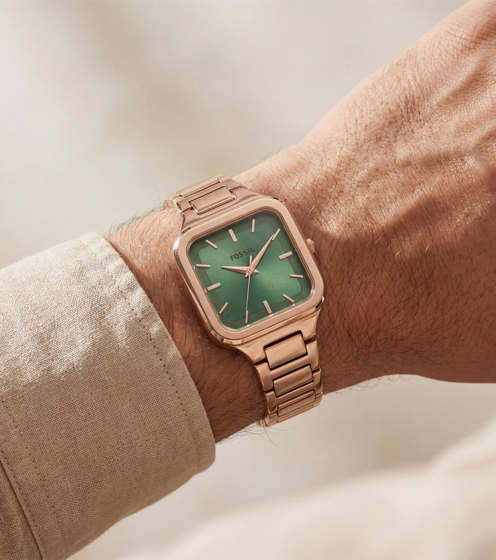 This elegant square-dial watch blends vintage charm with a refined modern aesthetic. The emerald-green dial paired with a polished gold-tone case creates a balanced and sophisticated wrist presence, suitable for both daily wear and special occasions.