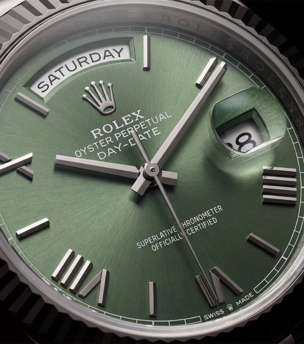 Applied Roman hour markers and coordinated metallic hands ensure clear readability while maintaining a classic aesthetic. The integrated day and date display adds everyday practicality, neatly positioned to preserve a balanced and sophisticated dial layout. The fluted bezel introduces a heritage-inspired touch, elevating the overall design.