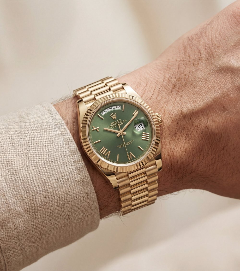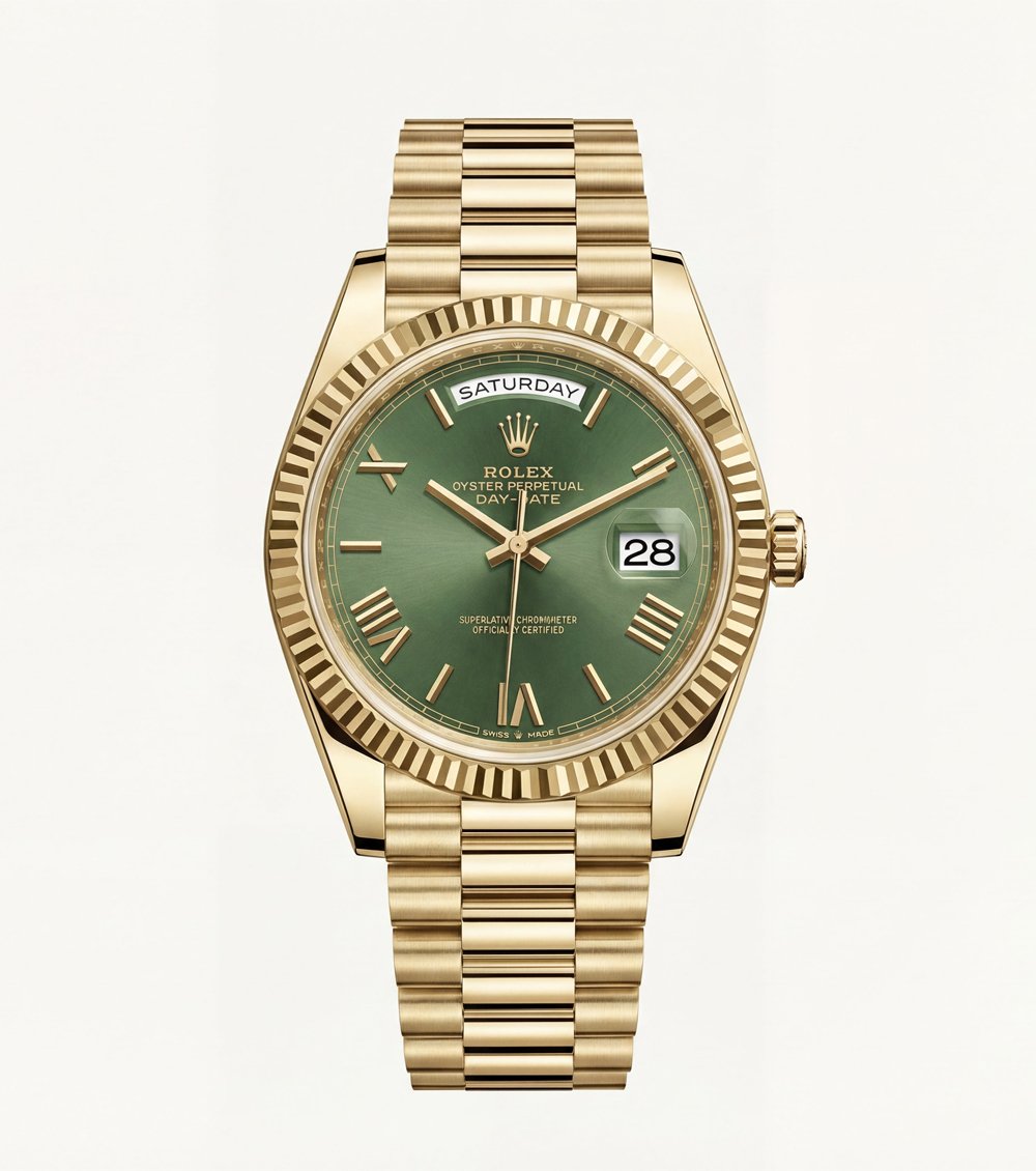 This premium gold-finish day-date Men’s watch delivers a bold yet elegant presence with its rich green sunray dial and classic Roman numeral hour markers. The polished gold-tone hands perfectly complement the dial, while the iconic fluted bezel adds a strong luxury character.