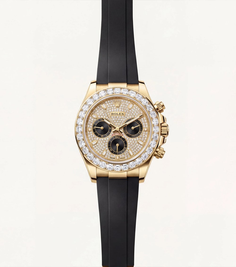 Be the first to review “Gold Finish Diamond Bezel Chronograph Watch with Black Rubber Strap” Cancel reply