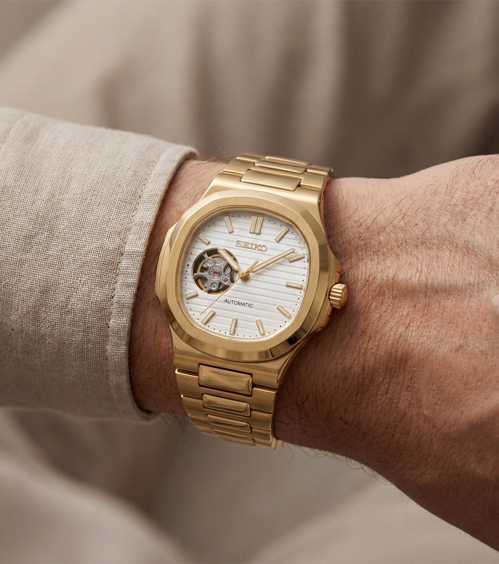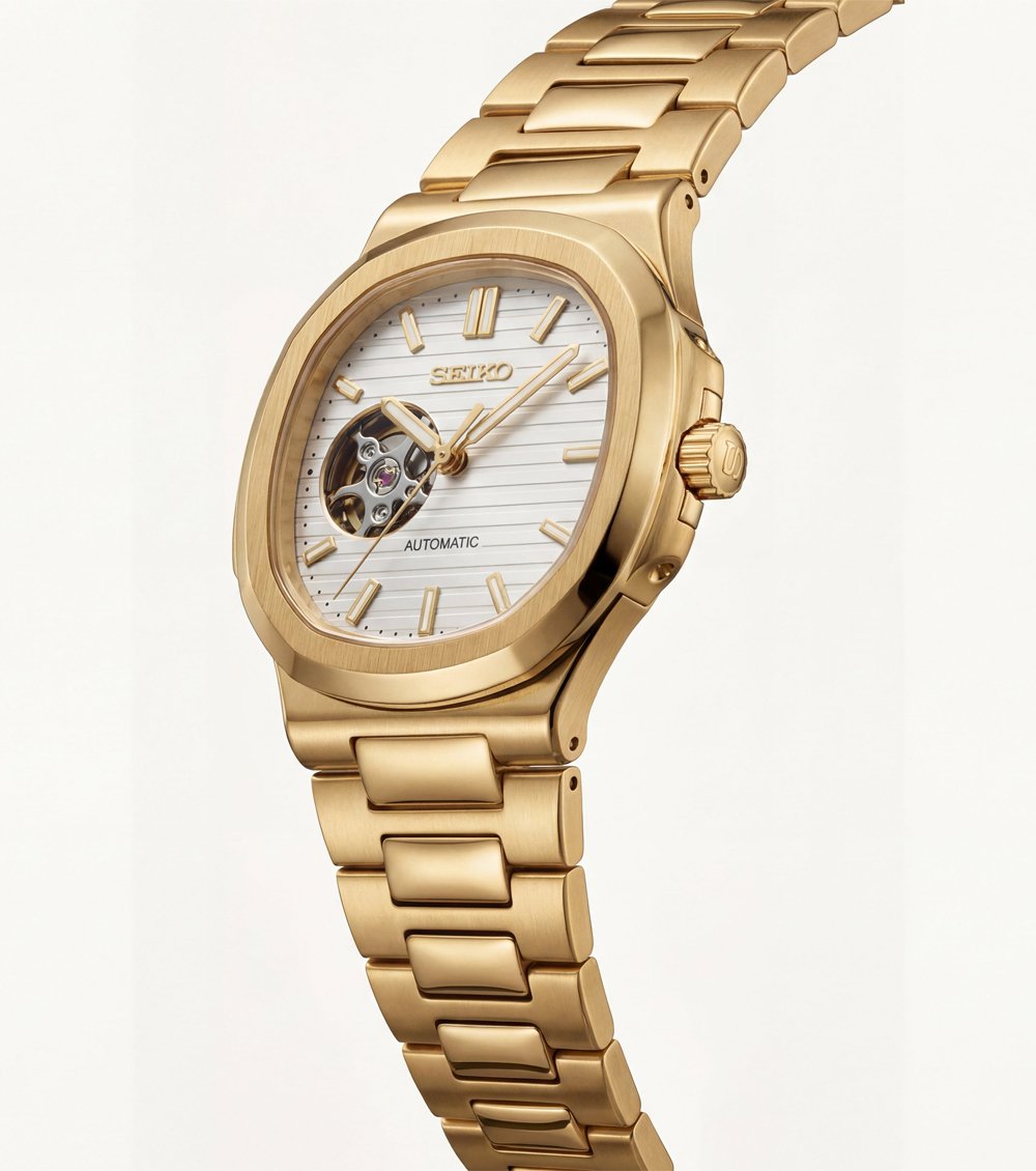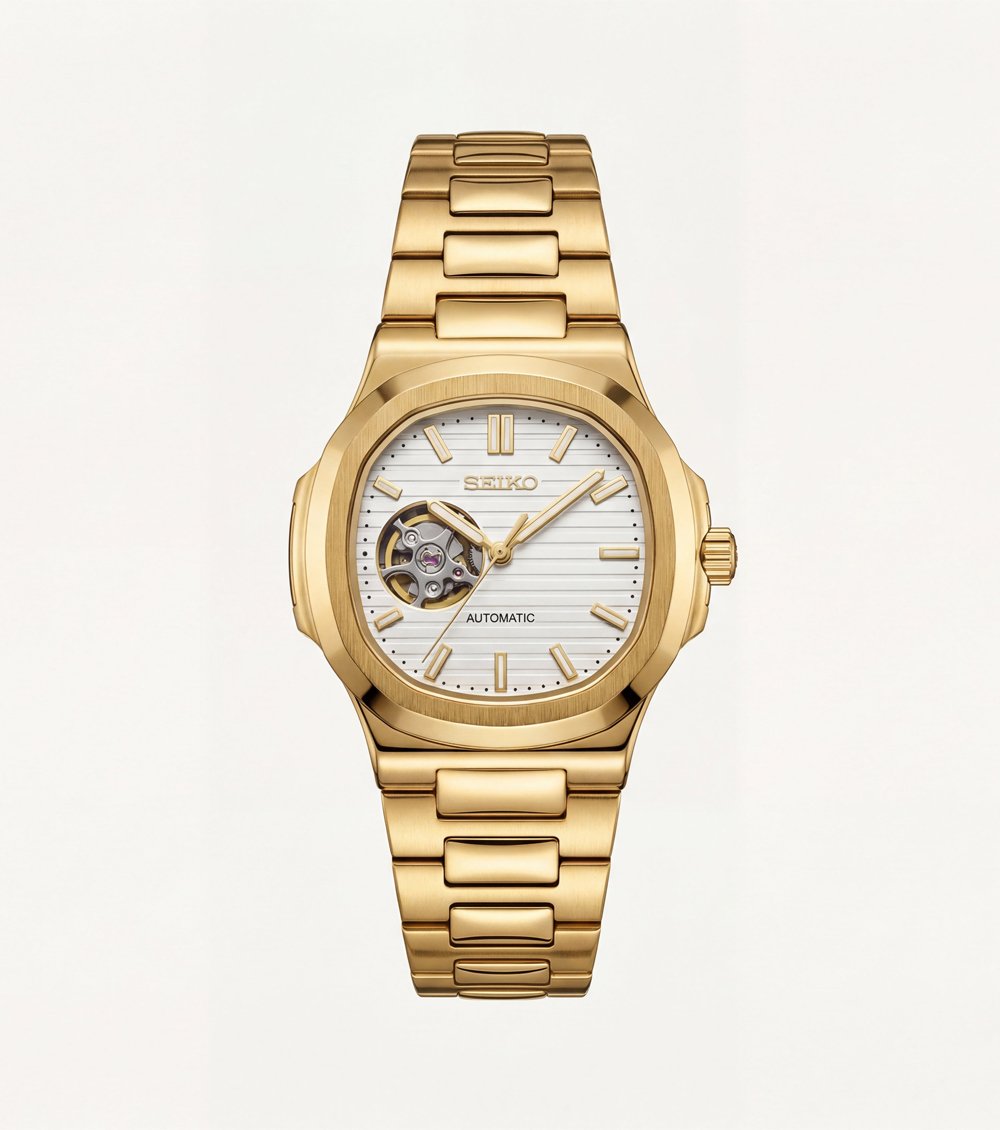 This refined automatic timepiece combines a rich gold-tone finish with a clean ivory textured dial, creating a balanced and sophisticated wrist presence. The structured cushion-style case and integrated bracelet deliver a seamless silhouette that feels both classic and contemporary.