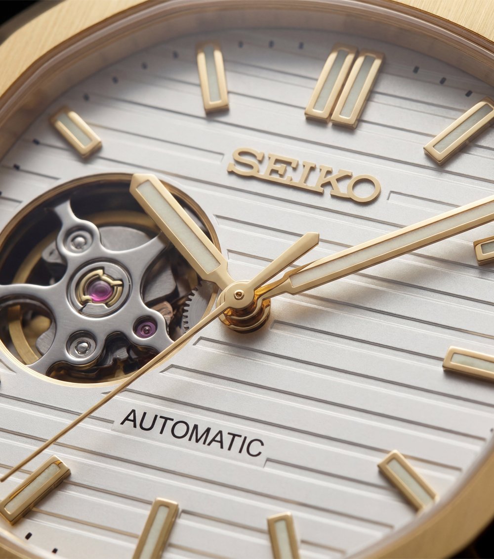 The horizontally detailed ivory dial enhances visual depth while maintaining a bright, elegant appearance. Applied gold-tone hour markers and polished hands ensure excellent readability, while the open-heart aperture reveals the mechanical movement in motion โ highlighting the craftsmanship within.