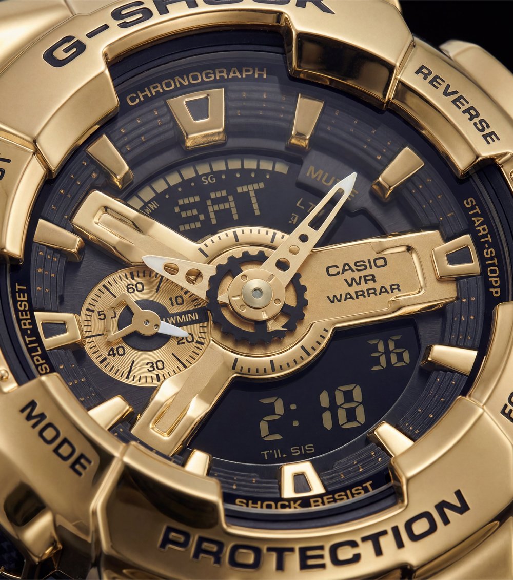 This bold hybrid chronograph sports watch features a striking gold-tone case paired with a deep navy dial, delivering a powerful luxury-sport presence. The layered analog-digital display adds depth and technical appeal, while high-contrast hands and markers ensure clear readability in all conditions.