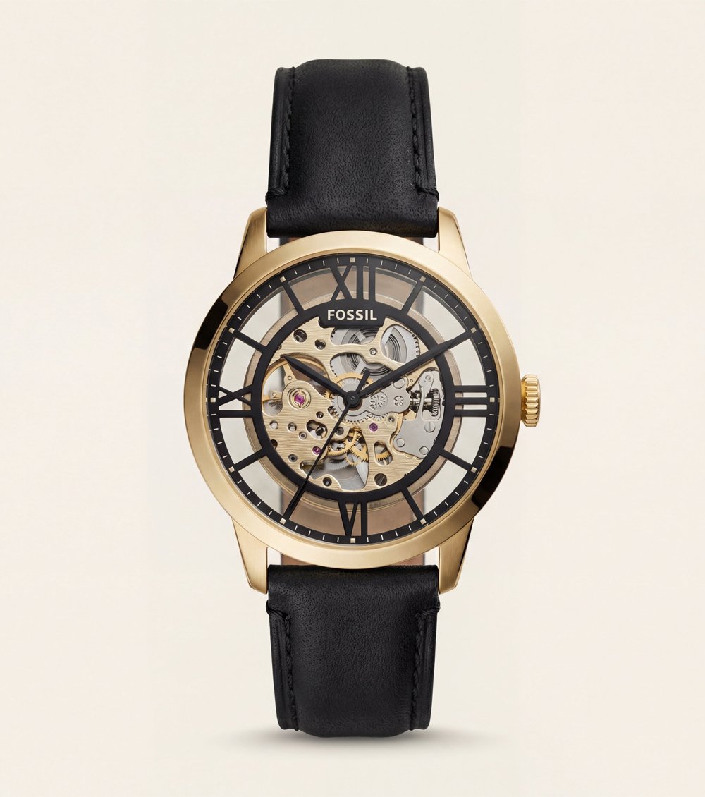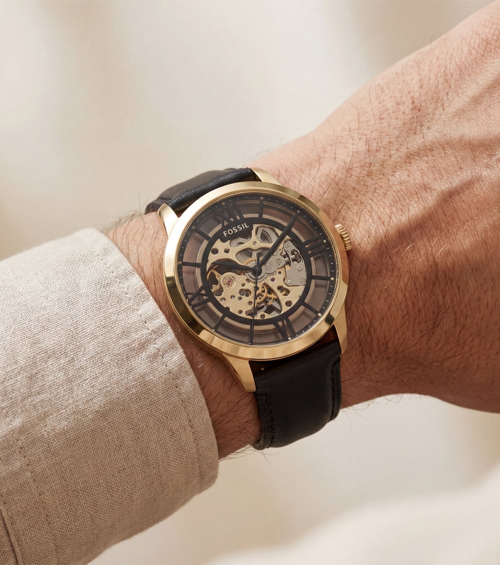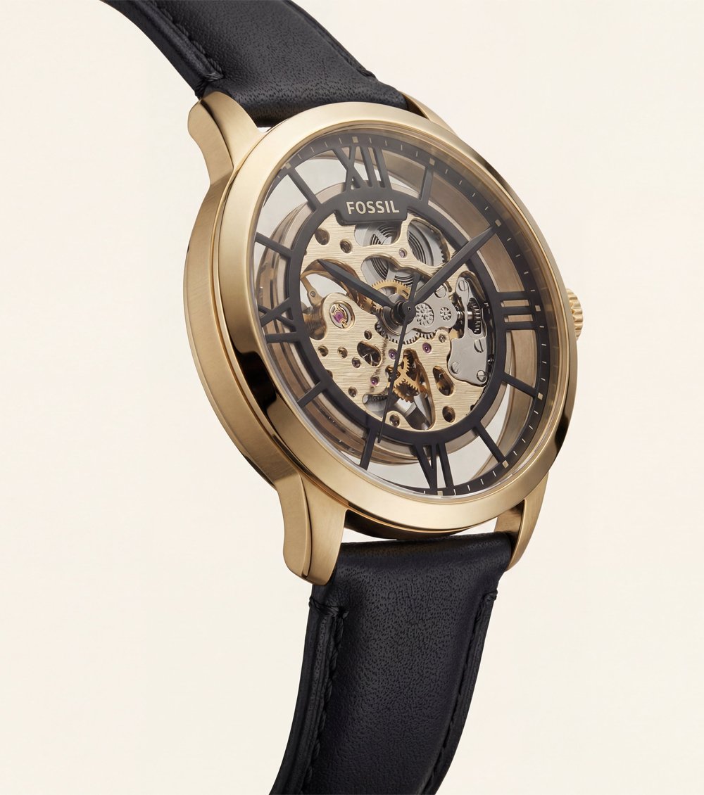 The polished gold-tone stainless steel case delivers a refined presence, while slim black hands ensure crisp readability without distracting from the skeleton design. Finished with a smooth black leather strap, this timepiece offers timeless sophistication and everyday comfort.