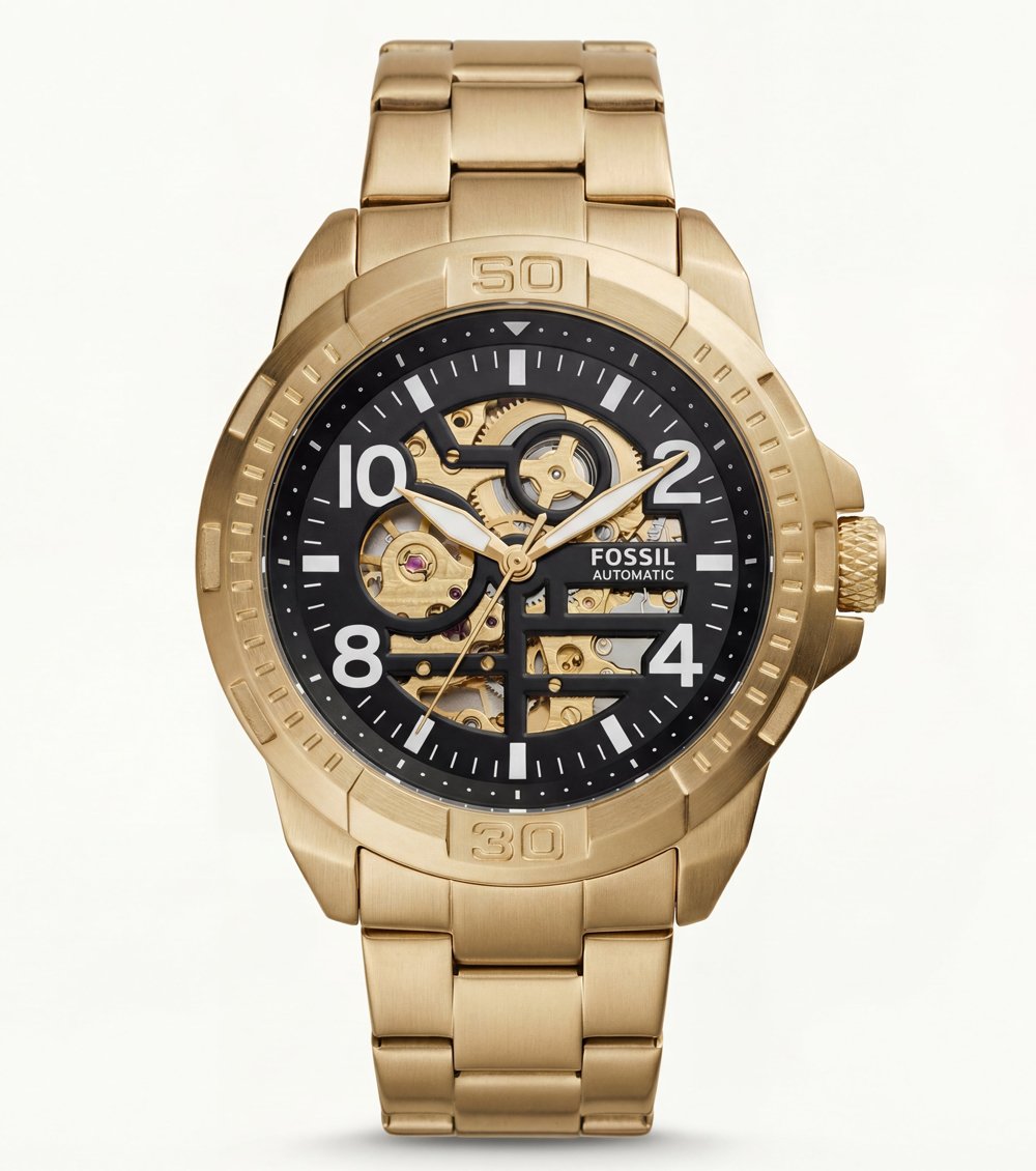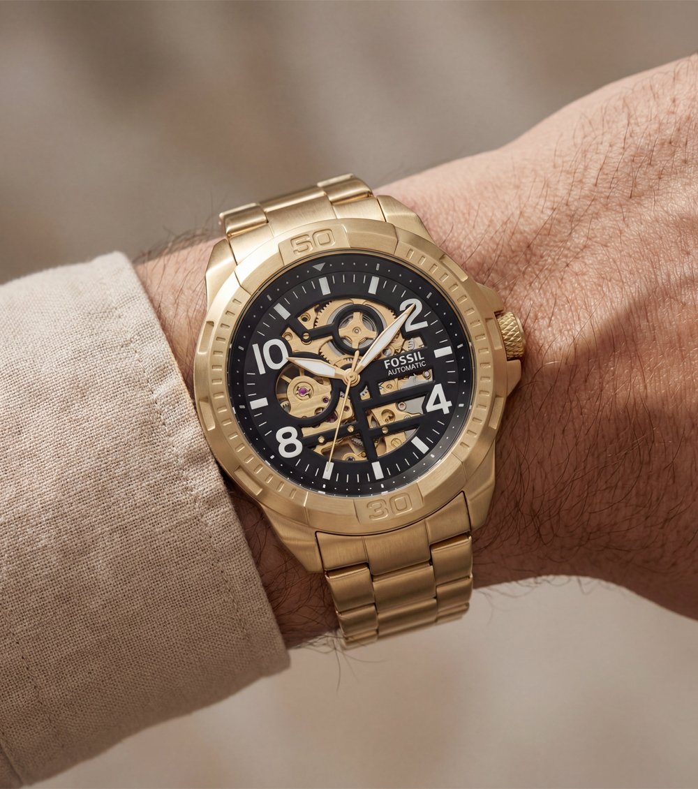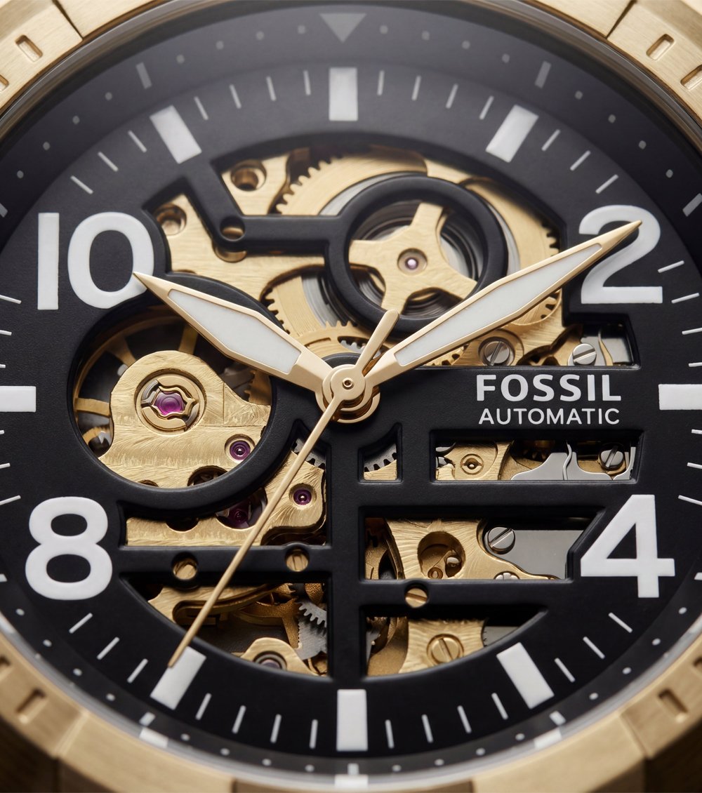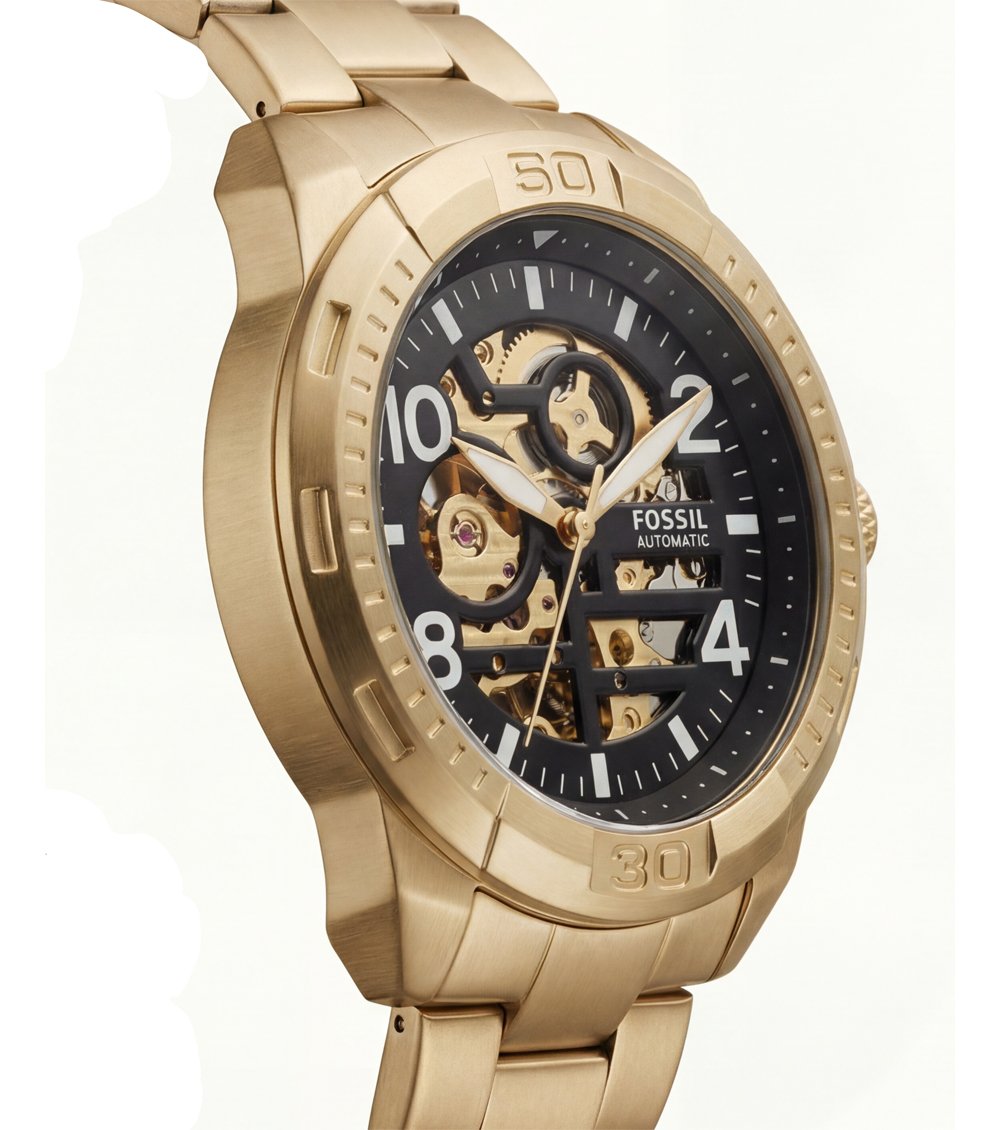 data-start=”83″>This bold automatic timepiece showcases a striking gold-tone stainless steel case and bracelet paired with a detailed skeleton dial that reveals the intricate inner mechanics. The open-worked design delivers a powerful visual impact, highlighting precision engineering and mechanical movement at every glance.