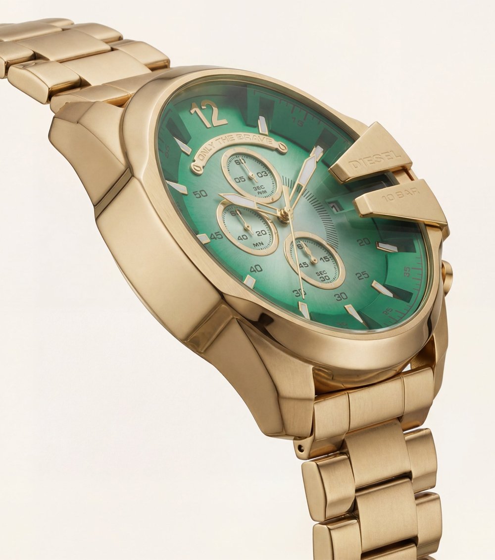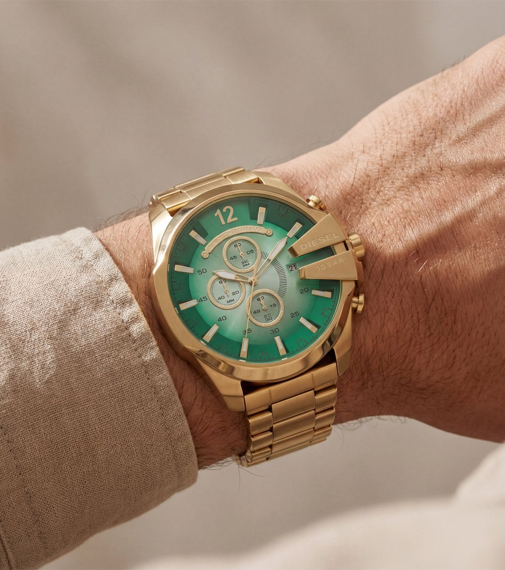 This premium Men’s chronograph watch features a rich emerald green dial paired with a full gold-tone steel case and bracelet, creating a bold luxury statement on the wrist. The sunburst dial finish enhances depth and shine, while the multi-subdial chronograph layout delivers a sporty yet elegant character.