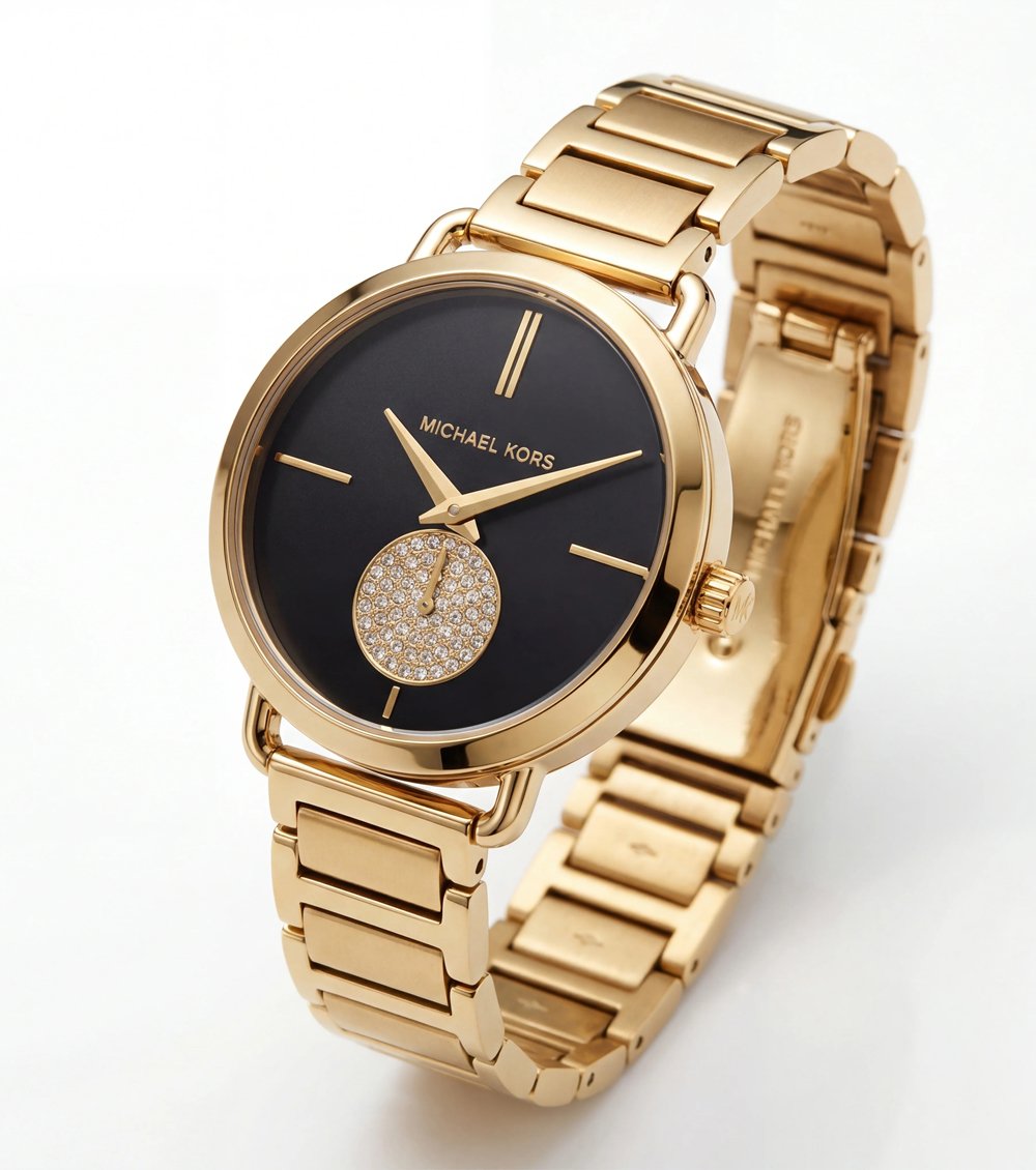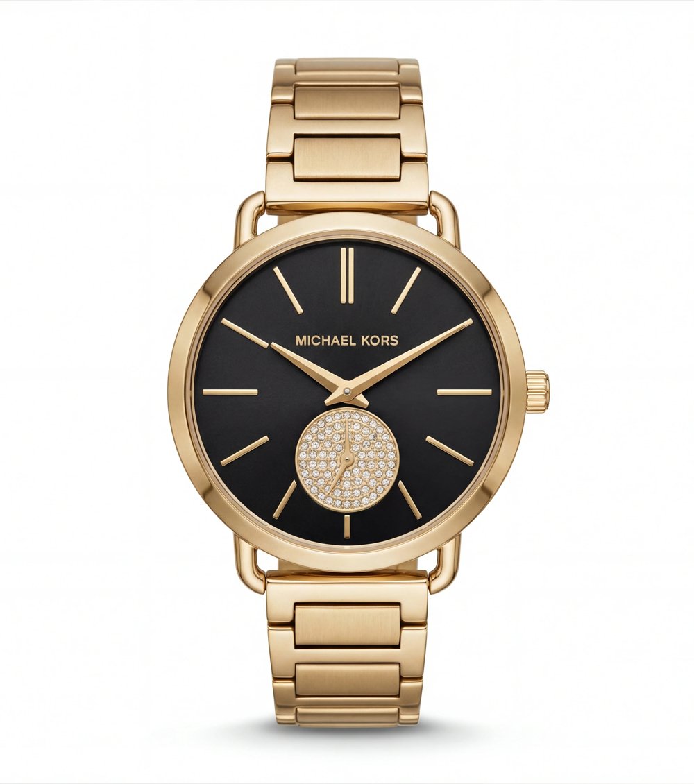 This gold-tone timepiece pairs a deep black dial with a polished golden case and bracelet, creating a bold yet refined statement. The clean dial design enhances its modern appeal, while the warm metallic finish delivers classic luxury.