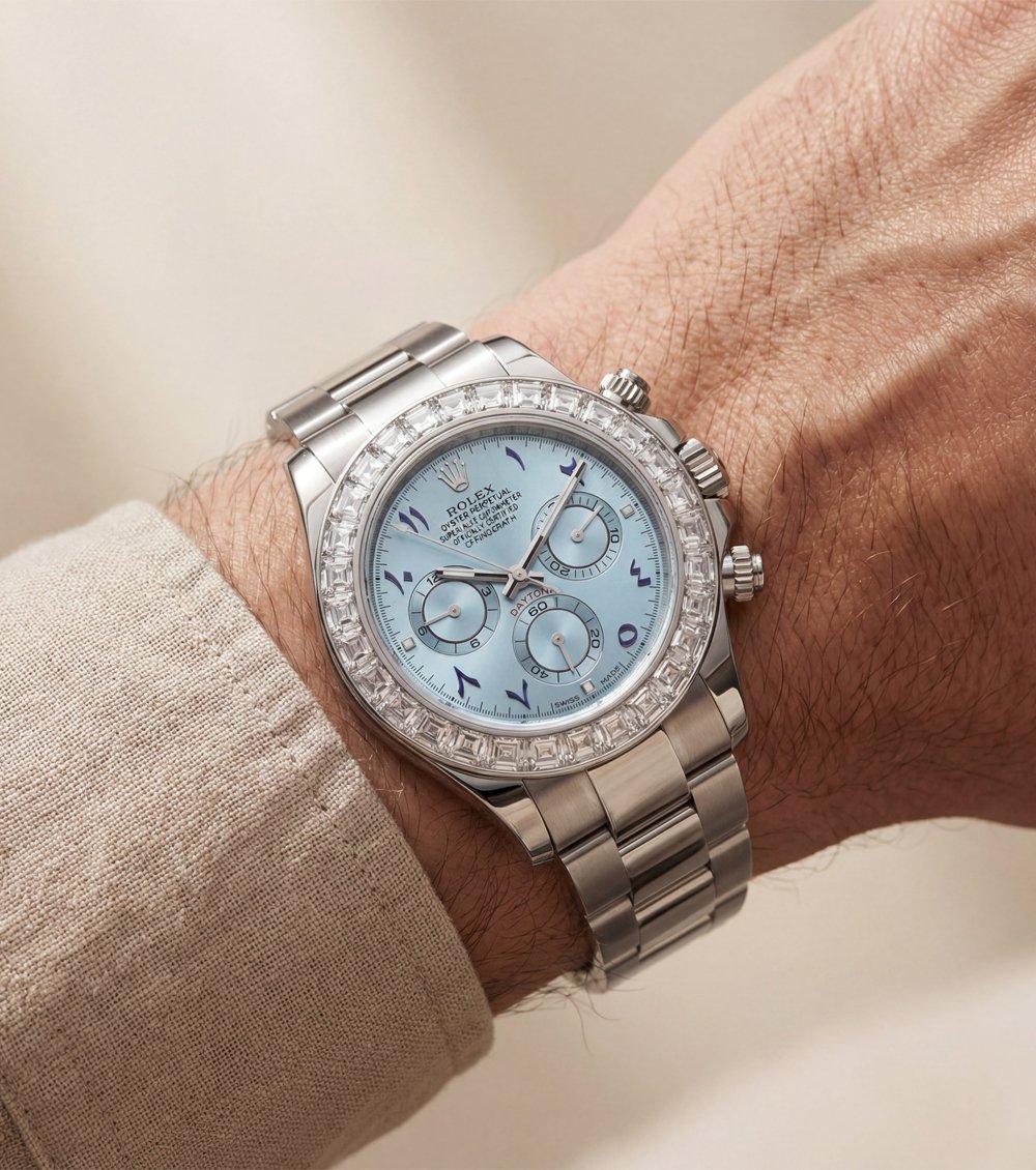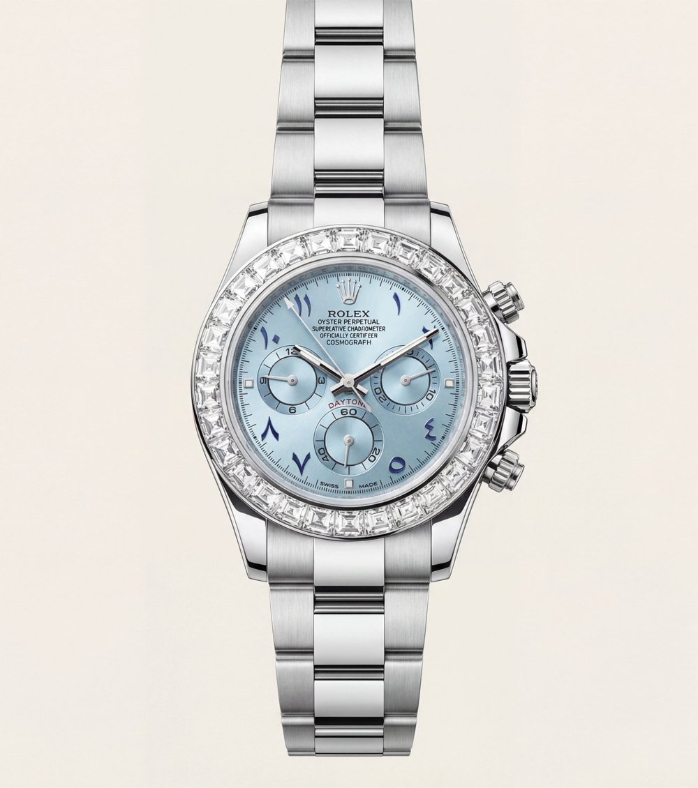 This exquisite chronograph watch combines luxury craftsmanship with high-performance design. Crafted in premium stainless steel, the timepiece features an elegant ice-blue dial enhanced by a brilliant diamond-set bezel that delivers unmatched wrist presence. The multi-subdial chronograph layout adds both functionality and visual depth, while unique numeral markers elevate its refined character.