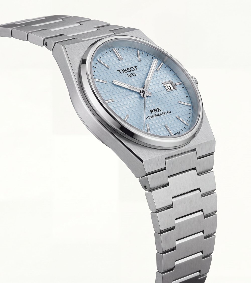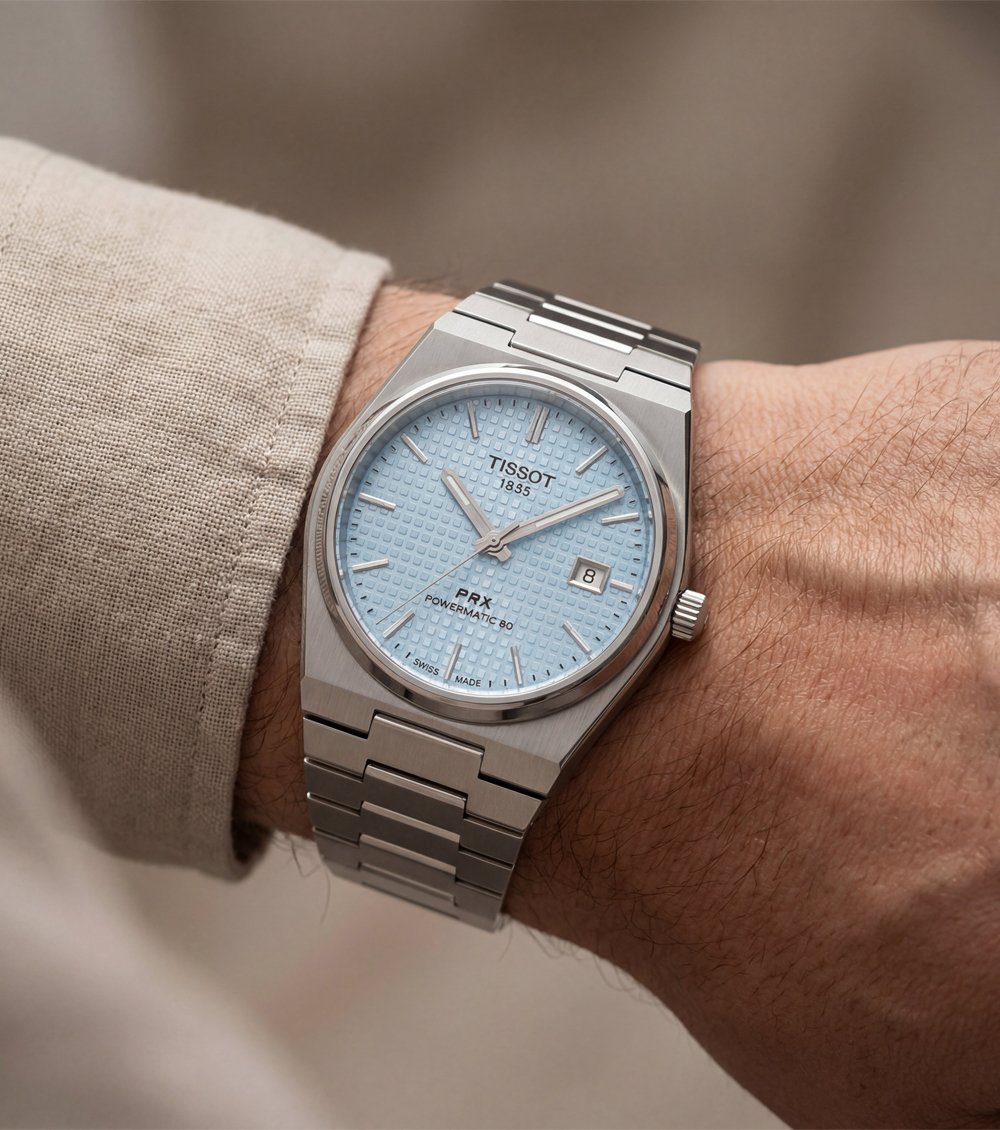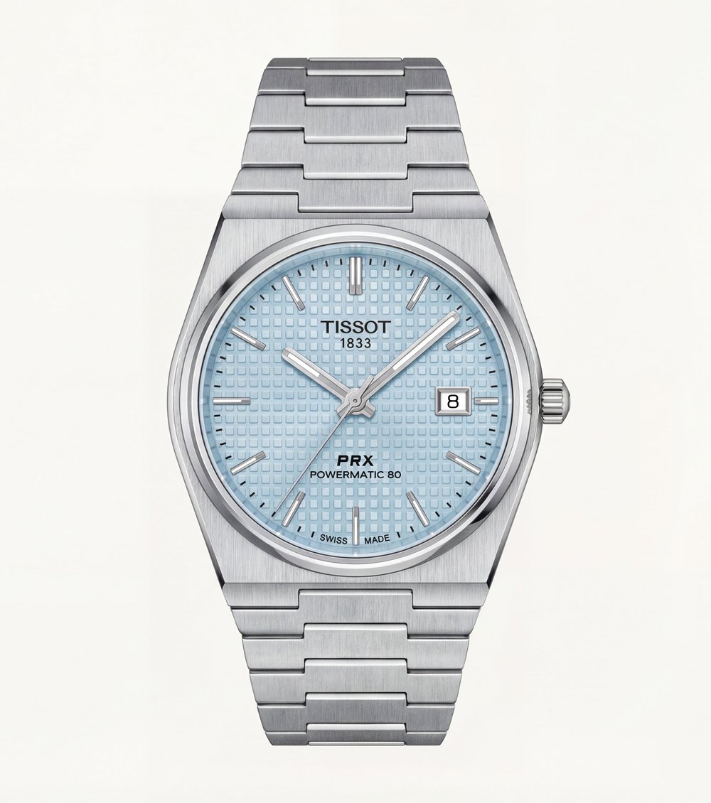 This refined automatic watch features a refreshing ice-blue dial with a distinctive textured pattern, creating a clean and contemporary wrist presence. The cool-toned dial brings a modern character, while the brushed steel case maintains a timeless and balanced design.