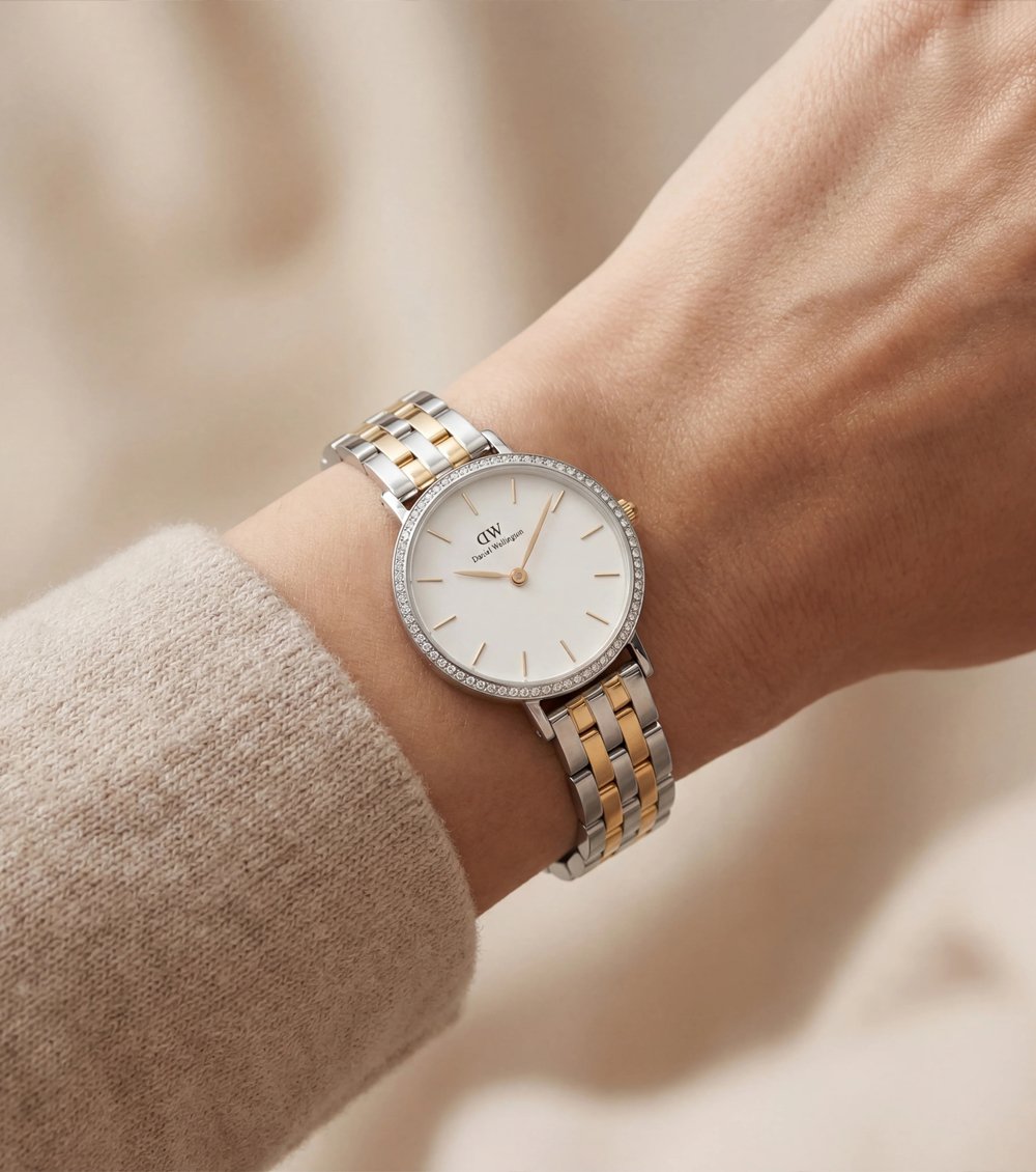 Encircling the dial is a delicate crystal-set bezel that adds subtle brilliance โ€” never overpowering, always graceful. The contrast of brushed silver links and polished gold center accents creates a harmonious dual-tone statement that transitions effortlessly from daywear to evening elegance.