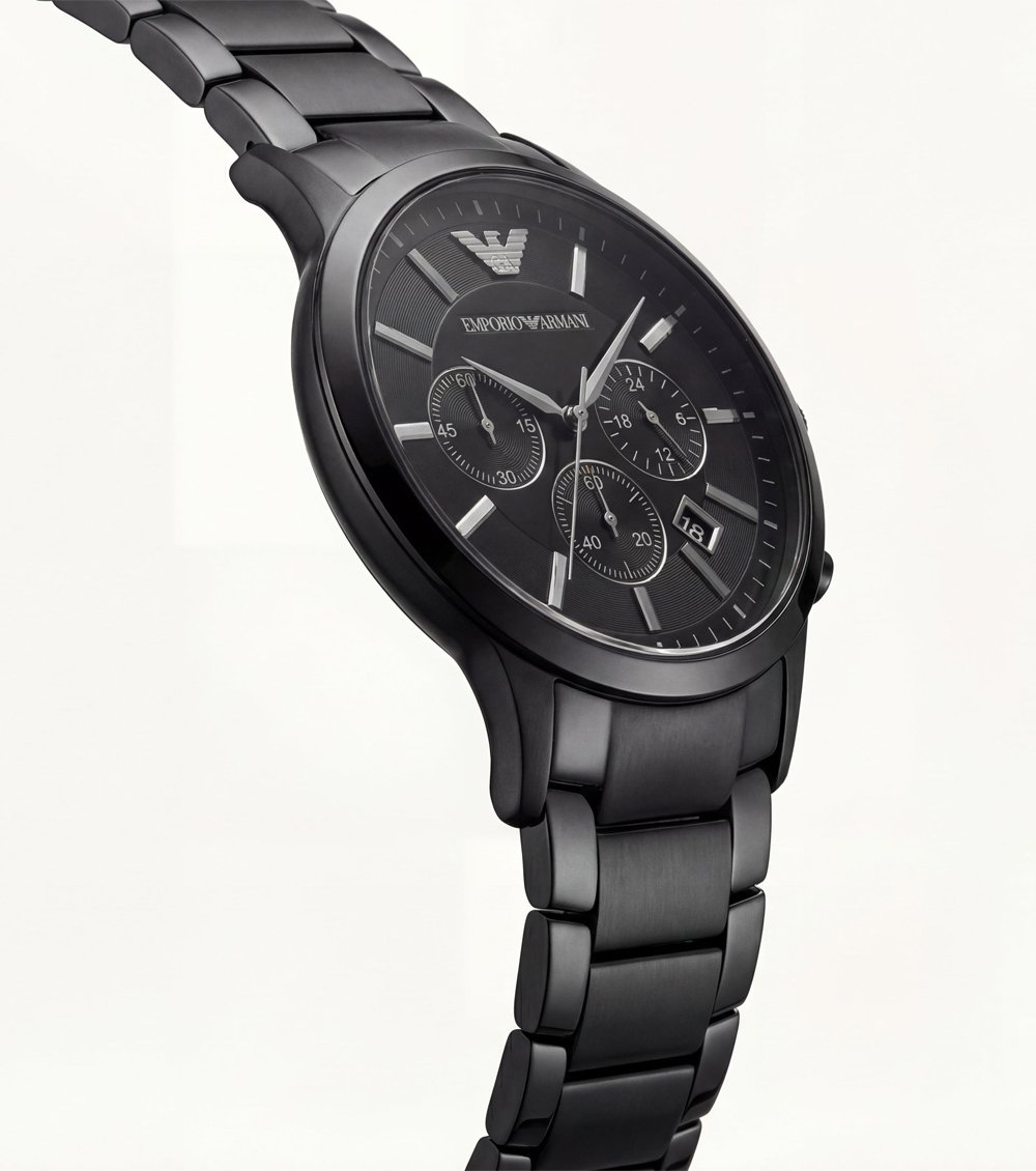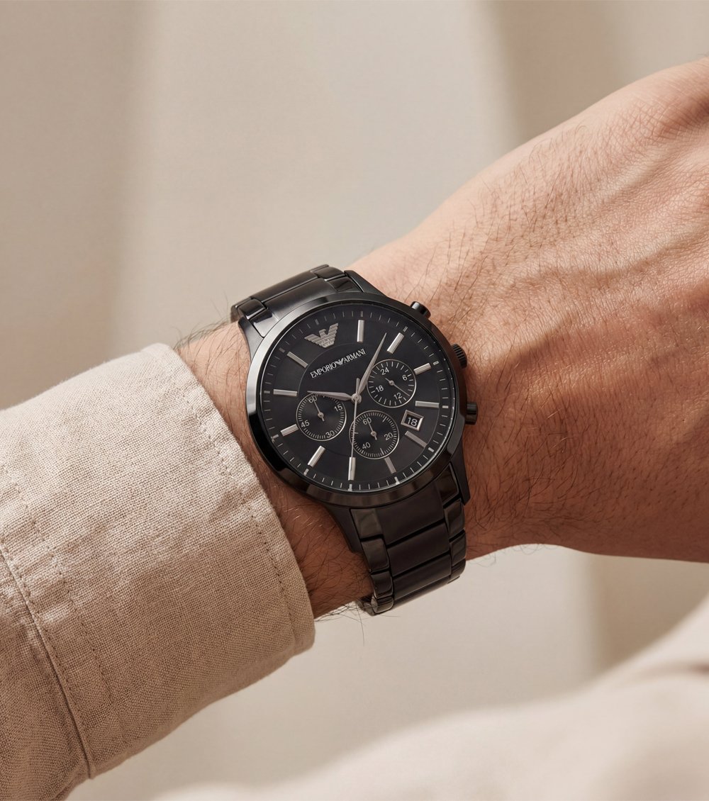 This bold all-black chronograph-style watch features a sleek matte stainless steel case and bracelet paired with a deep black textured dial. The multi-subdial layout adds a sporty yet premium appearance, making it ideal for men who prefer a strong, modern wrist presence.