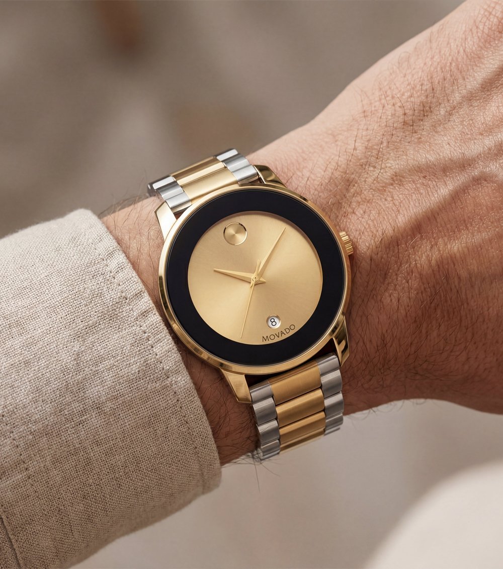 This luxury two-tone Men’s watch features a sleek gold sunray dial with a signature minimalist design. The clean dial layout is enhanced by a bold black outer ring and a refined date window, giving the watch a premium and modern appeal. Its gold and silver stainless steel bracelet adds elegance while ensuring durability and long-lasting comfort.