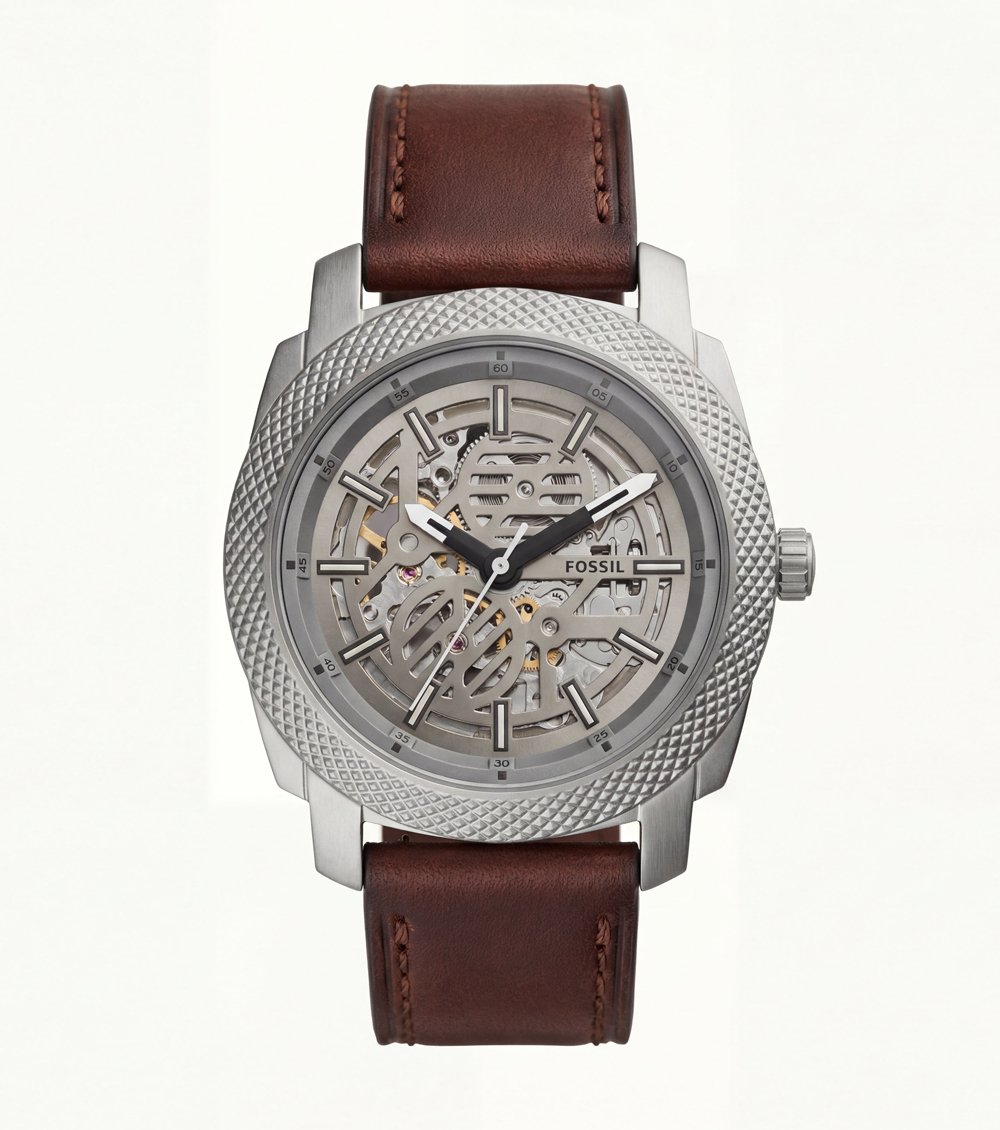 Luxury Skeleton Dial Automatic Men’s Watch with Textured Steel Case & Brown Leather Strap